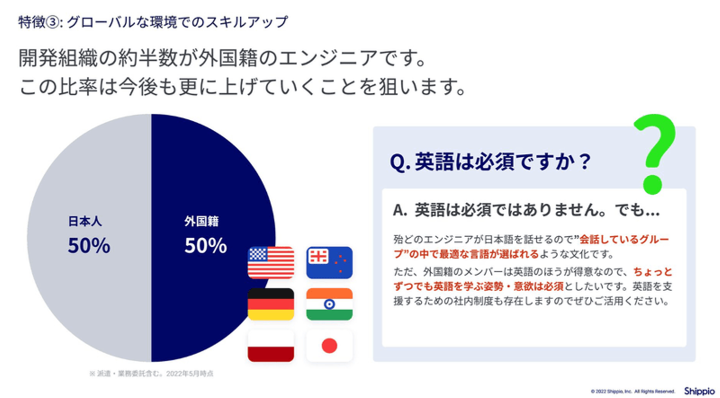 また、外国籍のエンジニアが多い点は大きな魅力になりうる一方、英語が不得意な方にとっては不安材料になるケースもあるため、英語でのコミュニケーションに関する注釈も設けることに。