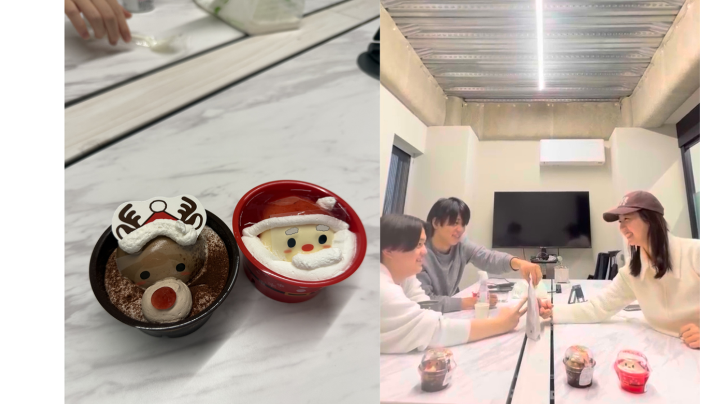 写真:クリスマスケーキを争う小林と社員
