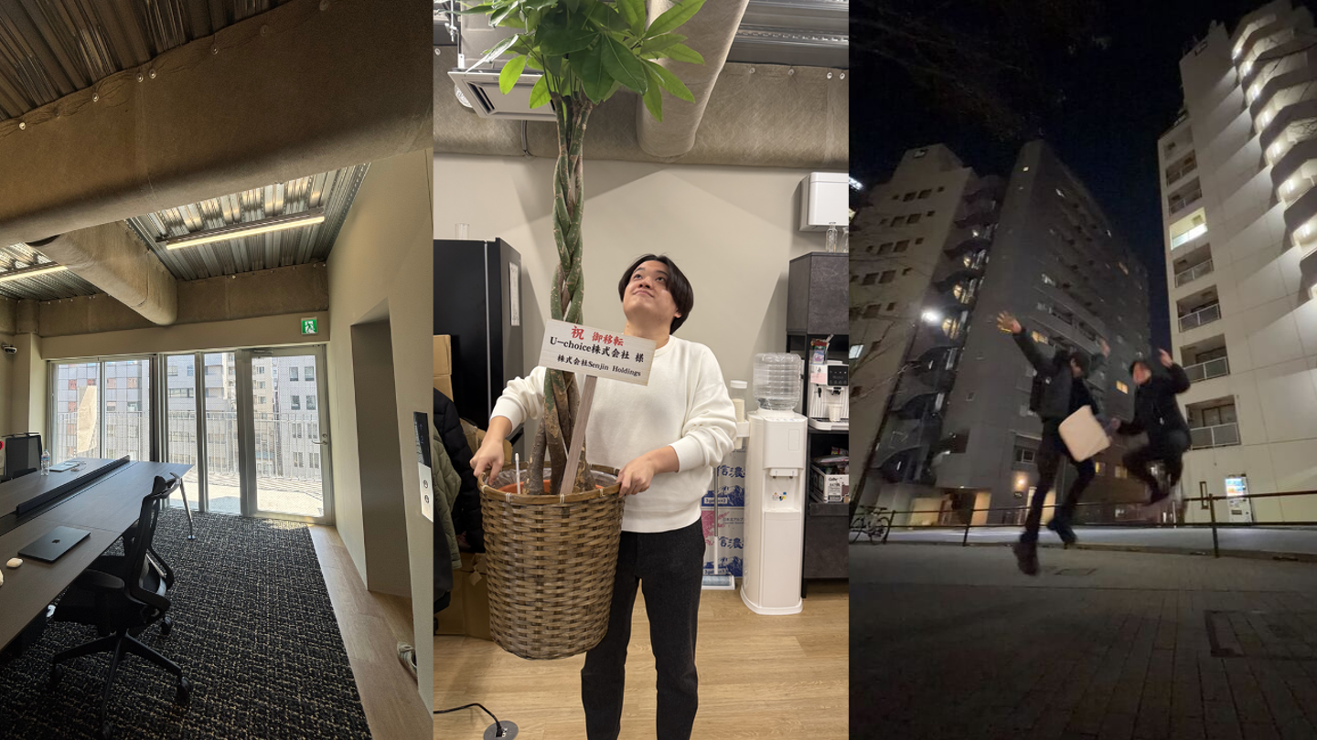 左:初日の半蔵門オフィス 中:オフィス移転時に頂いた木と小林 右:オフィス前でジャンプする小林と社員