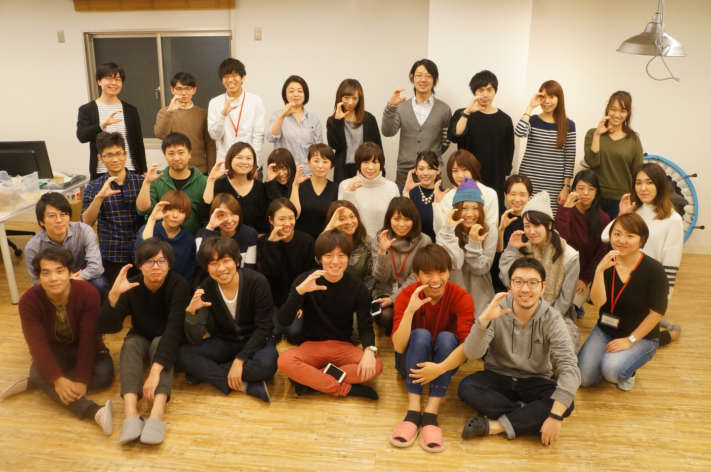 (入社当初よりはるかに増えた社員。コネヒトの「C」の文字を作って。/前オフィスにて)