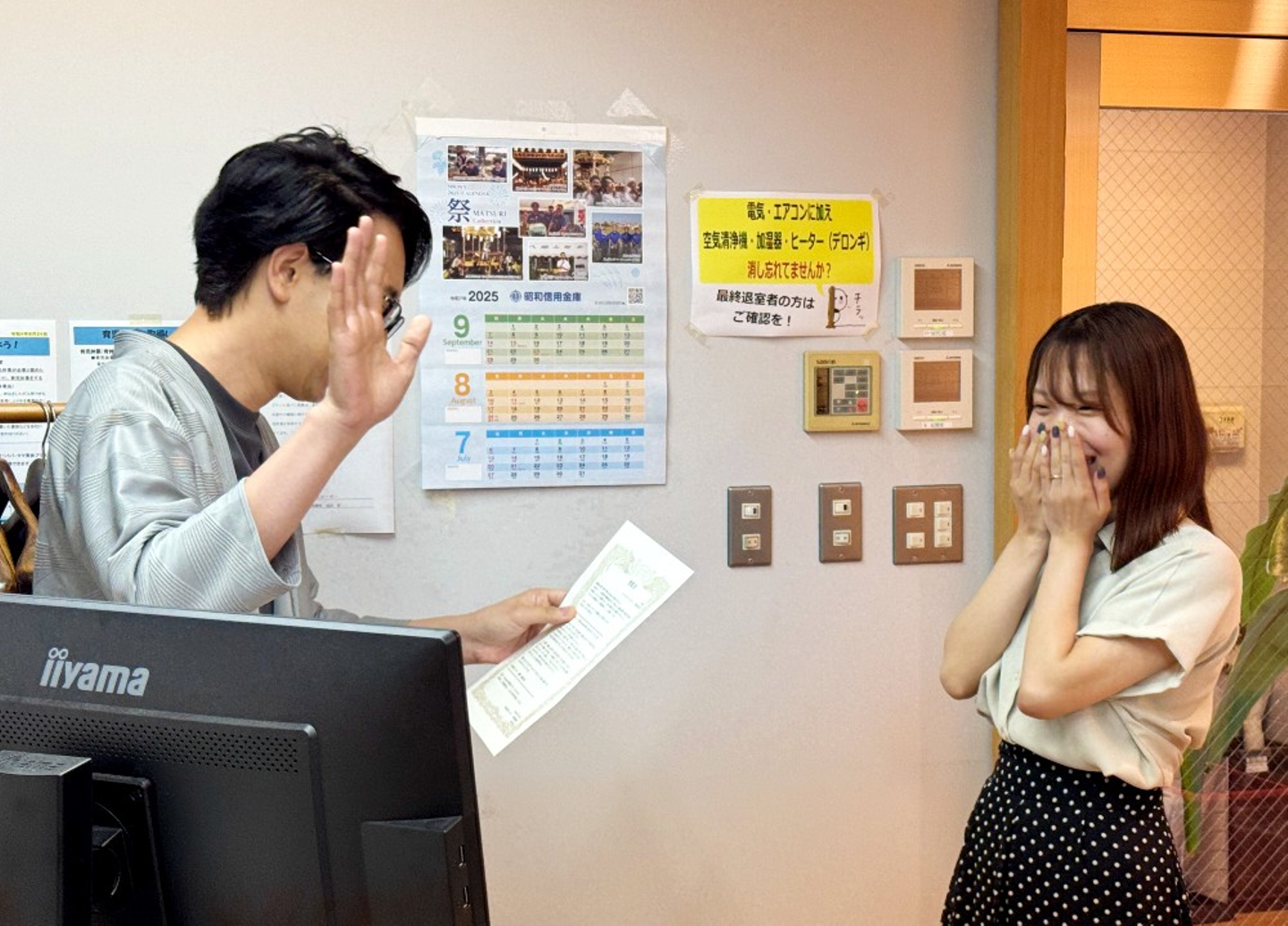 (初のGoghest受賞で喜ぶ佐藤さん。表彰状は営業顧問の齋藤さんより授与。)
