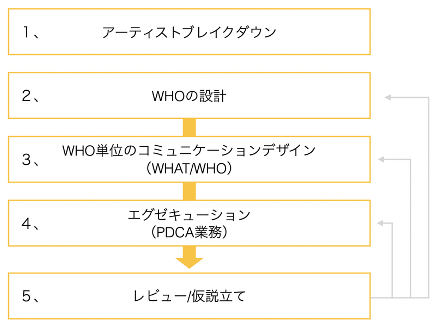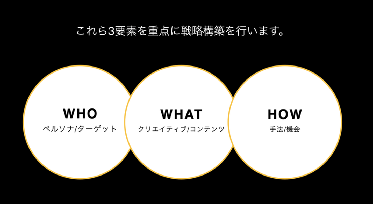 案件ごとに3要素の設計を忠実に行い言葉に変え、エグゼキューションを行います。WHOとWHATの設計が特に重点であり、戦略の指針であり基盤になると考えています。