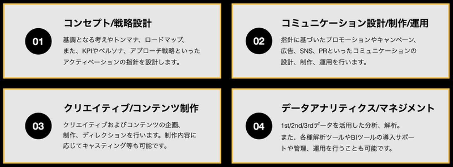 パートナー事業は、受託でアーティストの“パートナー”となって伴走し、デジタルマーケティング・統合コミュニケーションデザイン・事業開発の支援を行うサービスです。業務セクションとしては4つあり、 解決策の提示のみに留まらず、実行・検証・レビューとエグゼキューション (PDCA業務)まで行うことを基本としています。