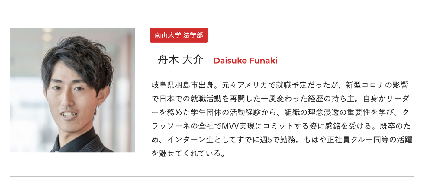 舟木くんは21卒内定者の中で唯一、「完全オンライン選考」で内定を得たクルーであり、21卒でありながら「既卒」であるという一風変わった内定者クルーです。そんな彼がなんと、先月行われた四半期に一度行われる全社会議「*クォーターミーティング(以下、QMTG)」にて、「*MVVアワード」を受賞するという快挙を成し遂げました。このブログでは、内定者でありながら大活躍している舟木くんが、一体どんな学生生活を送り、クラッソーネと出会うまでどのような人生ストーリーがあったのか、既卒として就活を始めるに至った背景、そして、新型コロナウィルス影響下での「完全オンライン選考」で、なぜクラッソーネへの入社を決断したのか。最後に、今後クラッソーネクルーとしてどんな活躍をしていきたいのかまで、舟木くんが経験した”事実”と”今ある想い”を全て語ってもらいました!
