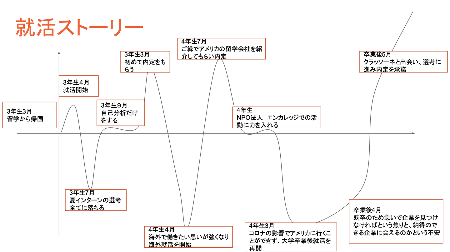 実は、僕は就活を3周しています。初めの就活は、留学から帰ってきて復学した3年生の始め。積極的に早期インターン選考や説明会に参加していました。しかし、面接にことごとく落ちました。自分がやってきたことや、出してきた結果には絶対の自信がありましたが、面接官から「なぜそのチャレンジをしたの?」など”Why”を聞かれたときに、上手に答えられない自分がいました。そこで自分自身のことを理解できていないと痛感したことから、自分のことをひたすら紙に書き出したり、友人や家族に自分の印象を聞いて回るなど、自己理解に徹しました。無事、とある企業に内定をいただき、一旦3年生の冬に就活は終えましたが、エンカレッジのメンターとして学生さんたちと話す中で「本当に自分がしたいことは何か」と再度見つめ直し、「海外で働く経験を若いうちに得たい」と思い、海外就活を開始しました。