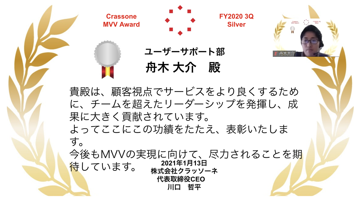 *MVVアワード:クラッソーネのMVVを体現したクルーを承認し、具体的な行動や成果を共有することで、MVVを体現するクルーを増やし、文化としてMVVを根付かせることを目的とした、2020年度から始まった新施策です。