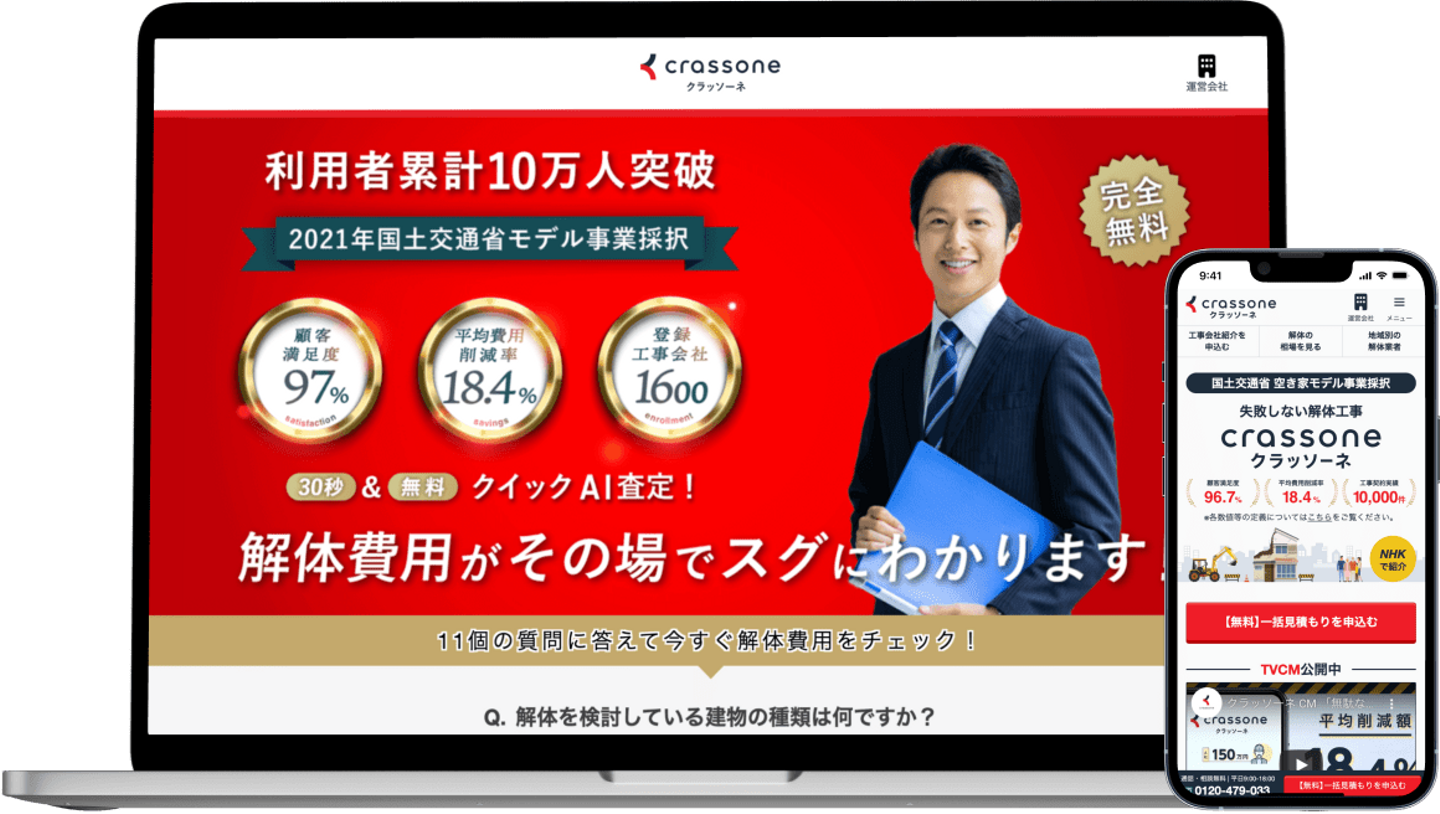 2020年4月に全国展開した新サービス「クラッソーネ」は、解体工事領域で、全国約1,600社の専門工事会社と施主をマッチングする一括見積もりWebサービスです。