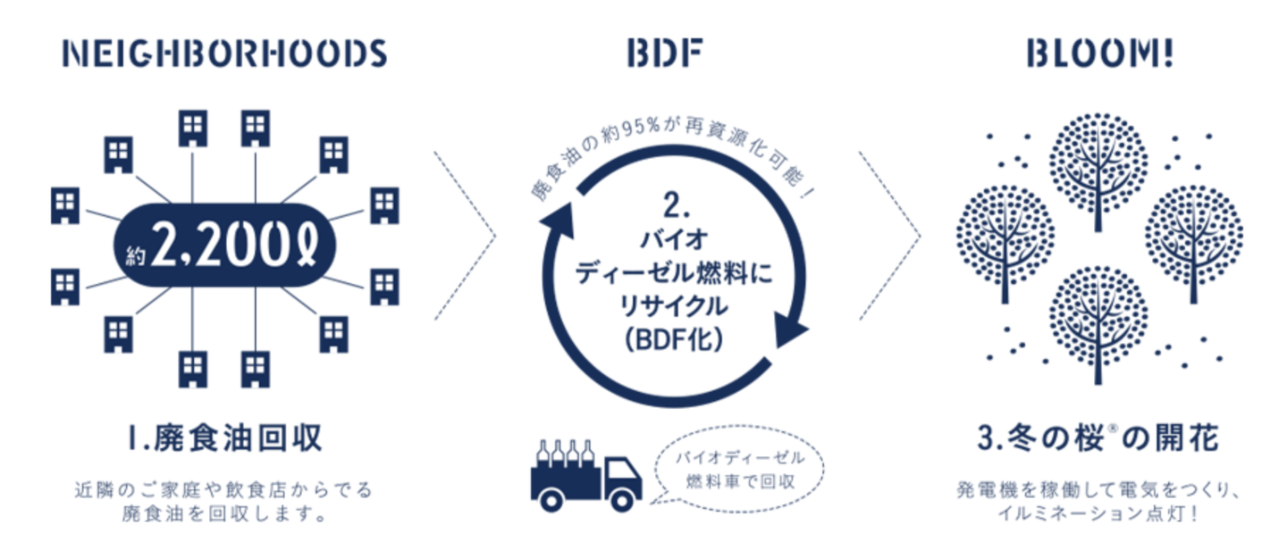 この想いを胸に我々は、東京電力に頼らない新しい仕組みのイルミネーション・イベントを行うことにした。当初の企画段階では、ソーラーや風力などの自然エネルギーの検討や、水素発電や発電床など、多岐にわたるエネルギー・ソリューションを検討した。しかしこれらは施工費が莫大であり、コスト的に単発イベントには向いていない。「とりあえずグリーン電力でも購入しとく?」的に自分に負けそうになっていたその時、スタッフの一人が発見してくれたのが「バイオディーゼル燃料」というソリューションだった。「バイオディーゼル燃料(BDF)」とは要するに、天ぷら油などの使用済み植物油をご家庭や飲食店などから回収し、精製し直した軽油燃料のこと。