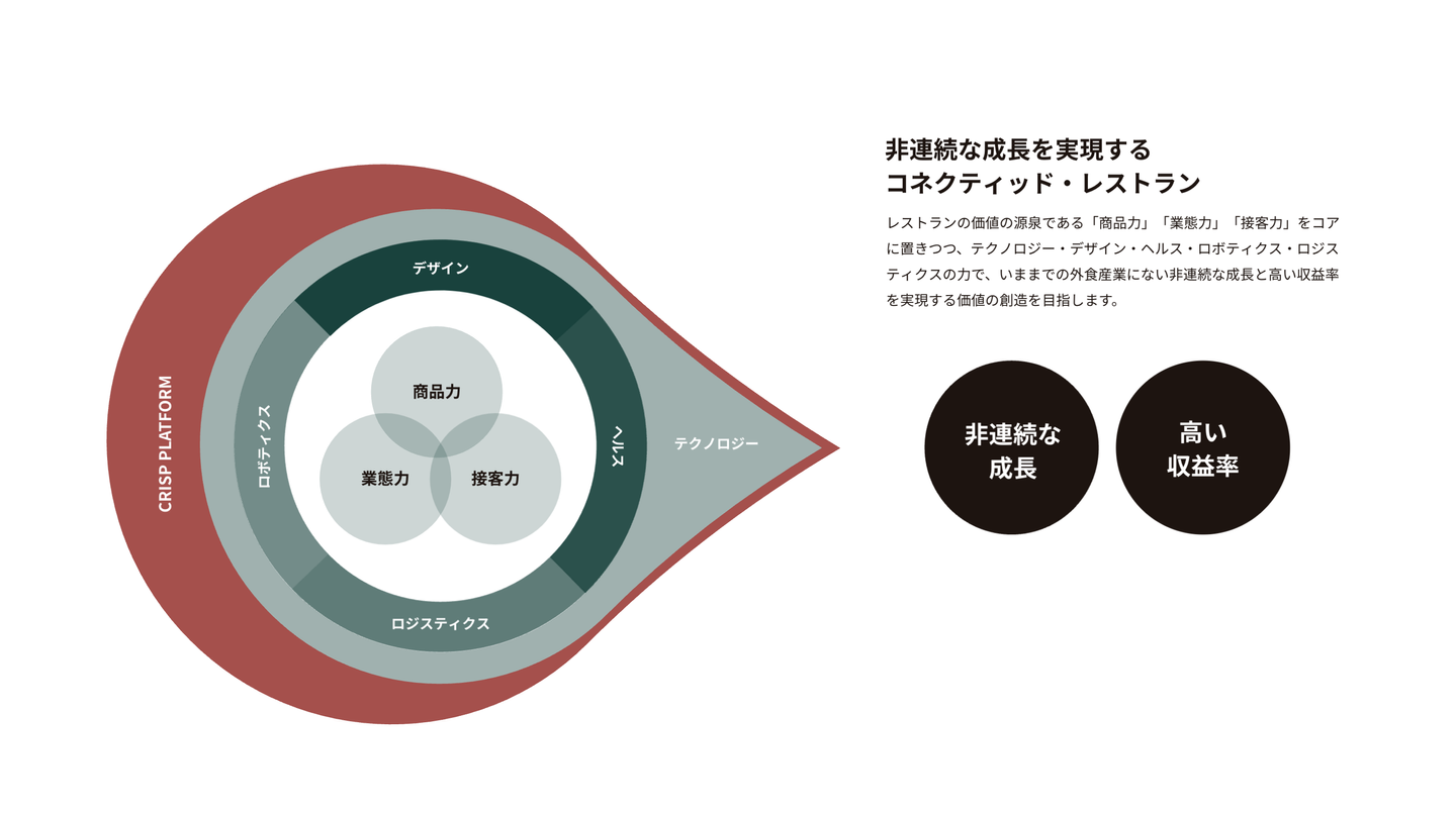 今回の資金調達により、CRISPが提唱する非連続な成長と高い収益率を実現する新しい外食企業の形「CONNECTED RESTAURANT(コネクティッド・レストラン)」に必要な5つの成長領域であるテクノロジー・デザイン・ヘルス・ロボティクス・ロジスティクスに戦略的な投資を行うことが可能となります。