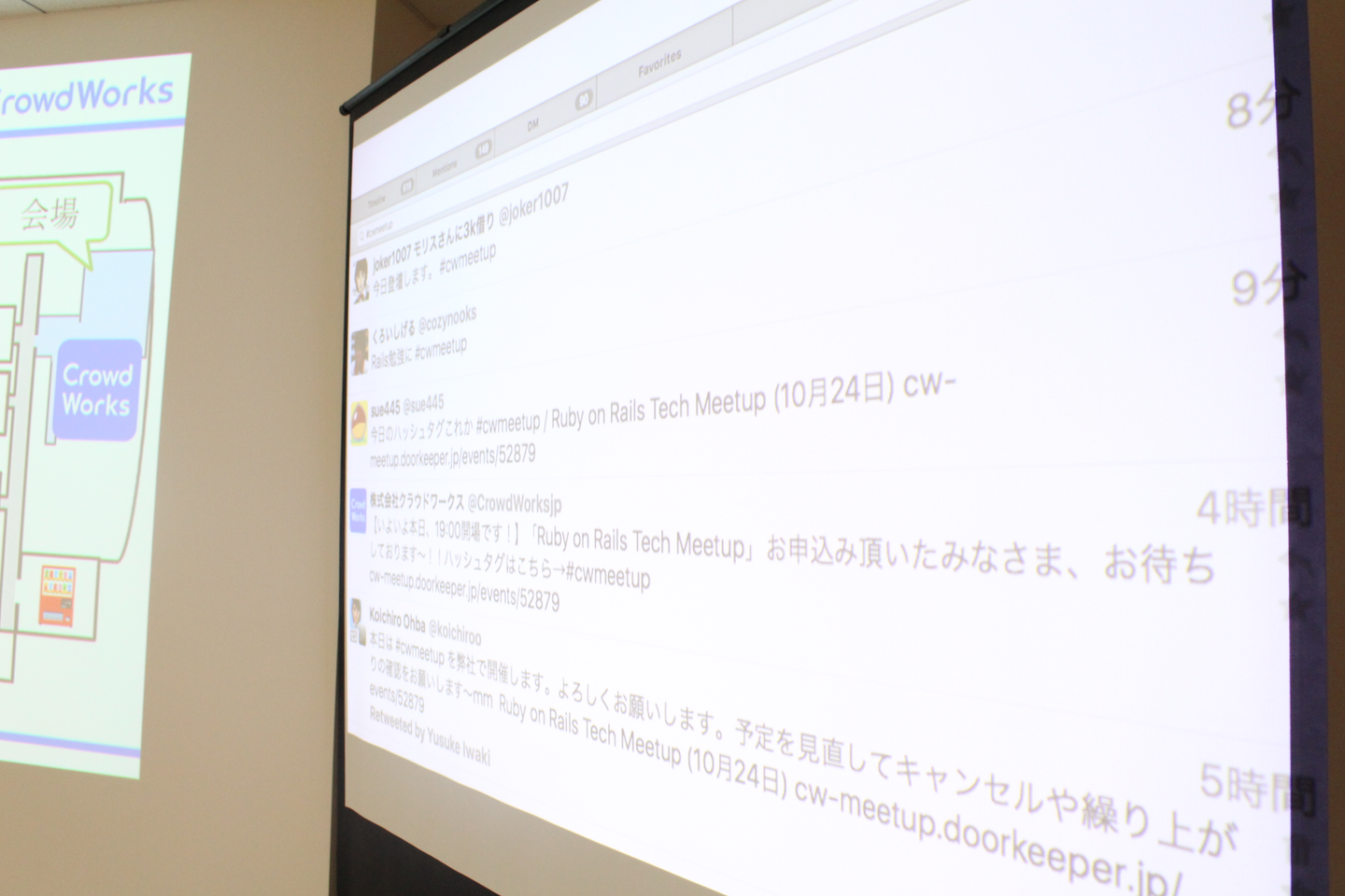 今回のMeetupは、「全員が気軽に交流できる場にしたい」というCIO大場の思いにより、Twitterのタイムラインを表示させるプロジェクターを設置!参加者のみなさんのダイレクトな感想がリアルタイムで共有されていました!