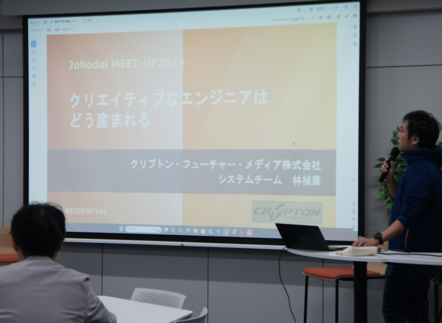 当社は、あらゆる分野のクリエイターの皆さまのクリエイティビティに貢献できるような製品やサービスの企画・開発を「メタクリエイター(=クリエイターのためのクリエイター)」として行っています。システム分野を担当する林もまたメタクリエイターであり、特別講義では「クリエイティブなエンジニアはどう生まれる」をテーマに、自身の経験で感じたことや、エンジニアとして働く上で役立った情報・考え方について伝えました。