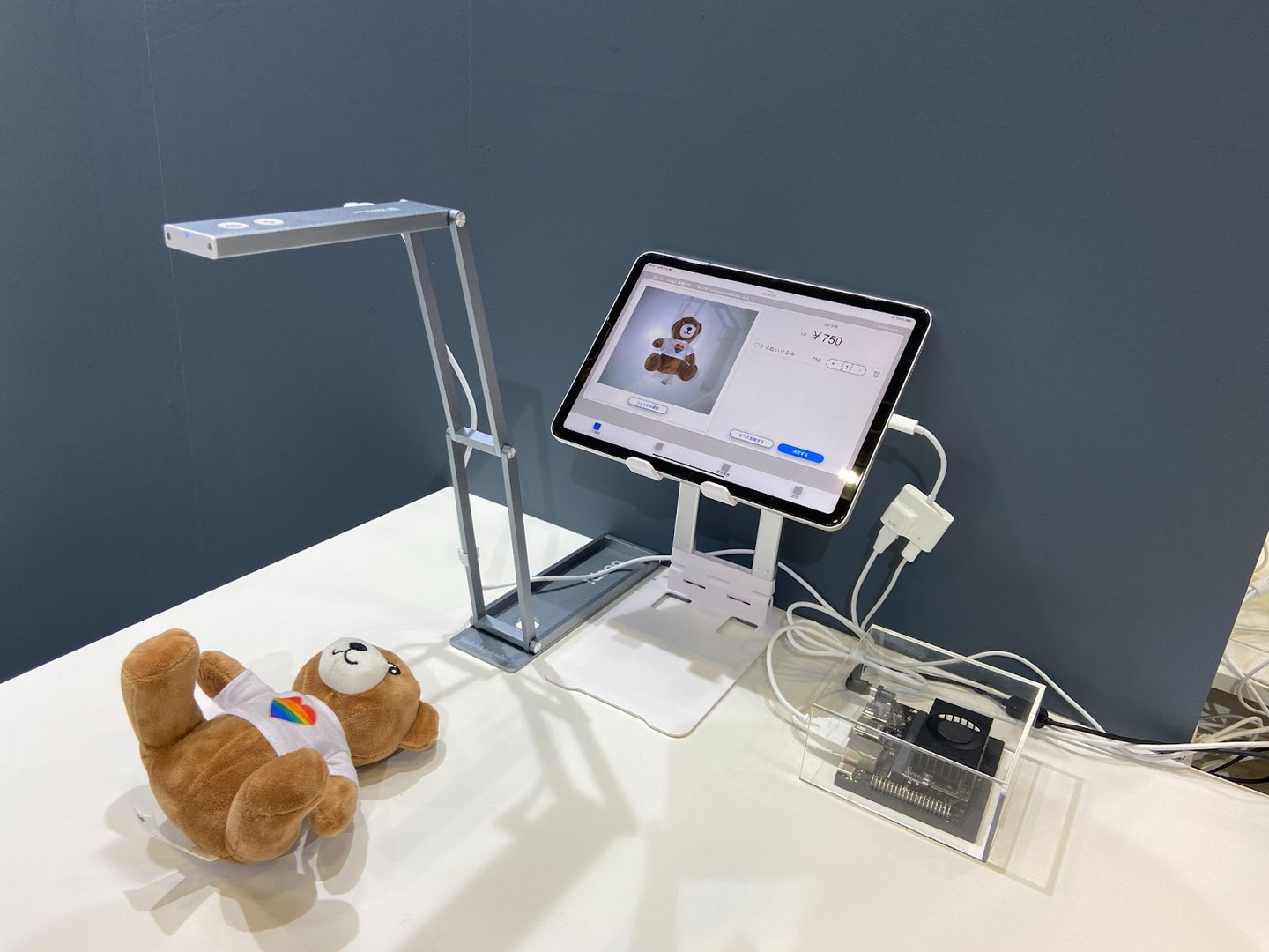 出展期間中は非常に多くのお客様にブースにご来場頂き、実際に「AIレジ・Truly」のデモ機を体験して頂く事ができました。実際のレジに近い体験をしていただくため、クマのぬいぐるみを商品に見立て、設置されているカメラで撮影し、商品種別と金額をレジに連携。ローカルエリアでAI処理を行うエッジコンピューティング技術を使う事で、最短0.2秒で画像認識を行い、レジ処理を行うことが出来ます。