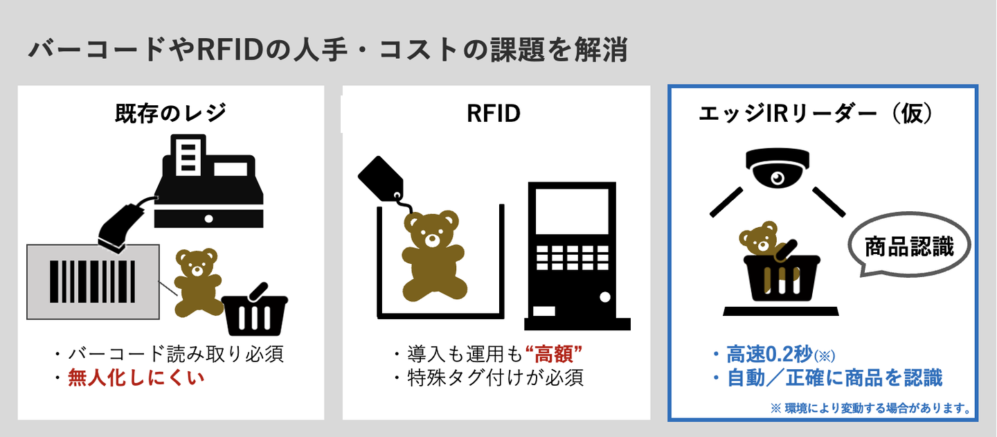 今回私たちが公開した「AIレジ・Truly」は、カメラが撮影した映像をAIが画像解析し、学習した情報から商品を判別することができるという仕組みになっています。つまり、人が野菜を見て「この形と色はナスだ!こっちはキャベツだ!」と知識に基づいて判断するのと同じように、AIがカメラで捉えた物体を判断をしているというわけです。AIに商品を学習させるという行程が必要となりますが、AIが商品自体を見て判断するので、バーコードやRFIDを取り付ける必要がありません。そのため「人手不足なんだけど既存の無人レジが高額すぎて導入できない」と悩む小さな小売店や、バーコードが添付できないようなイベントグッズ、食料・飲料などを取り扱う店舗での活用が期待されます。