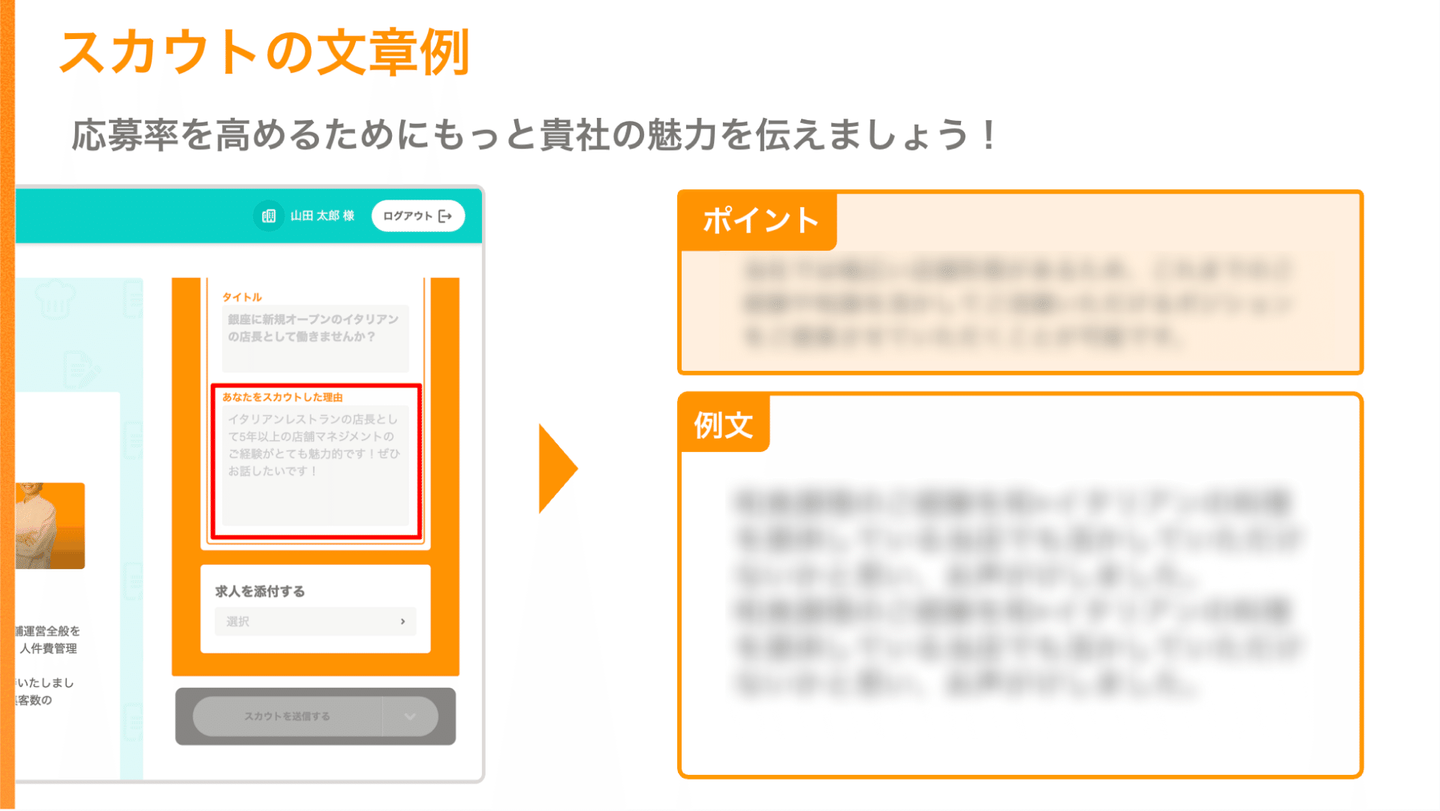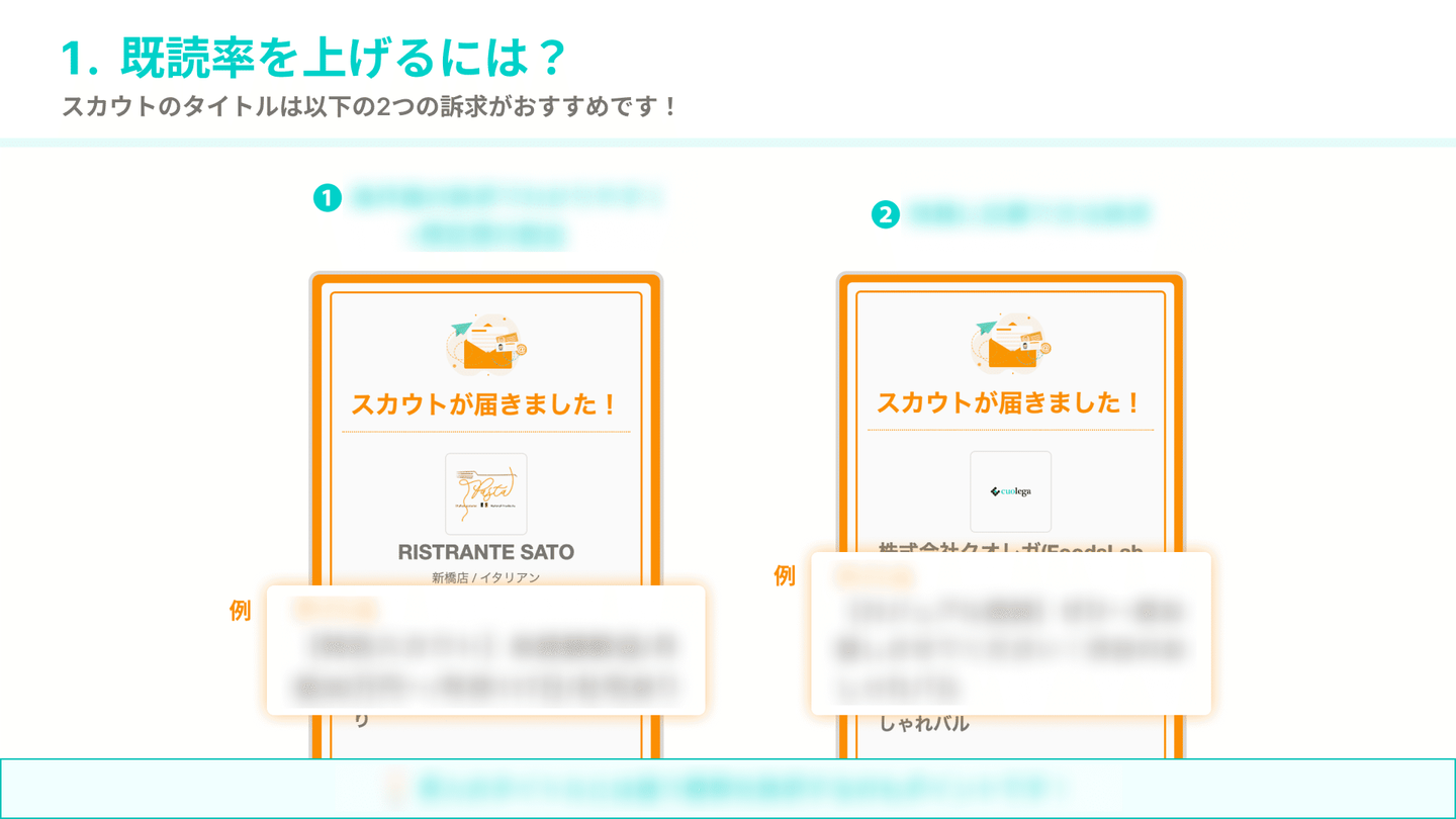 FoodsLaboに関しては、「一括送信、自動送信などの機能は意図的に作らず、通数制限+1通ずつの価値を担保している、高い既読率・応募率、スカウトでの採用成功事例」をお伝えし、スカウトのイメージを覆す商談を心がけています。