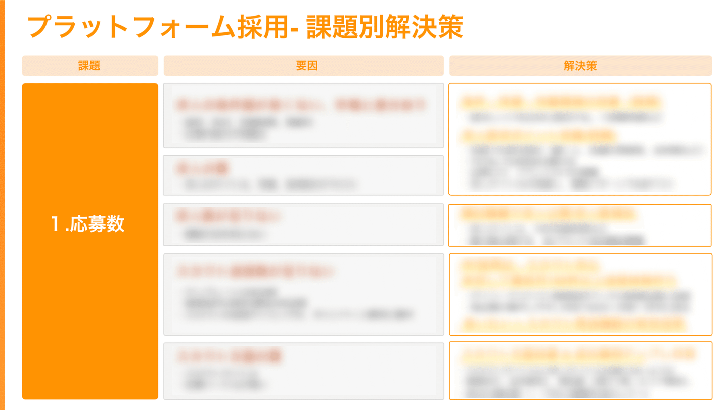 例えば、プラットフォーム上で、応募数が足りない時は、正直なところ要因と解決策はこれまでのプラットフォームの運用実績からパターン化されていて、御社の場合は、このパターンなので、こういう解決策を行なっていきましょう、と伝えた方が理解していただきやすいです。