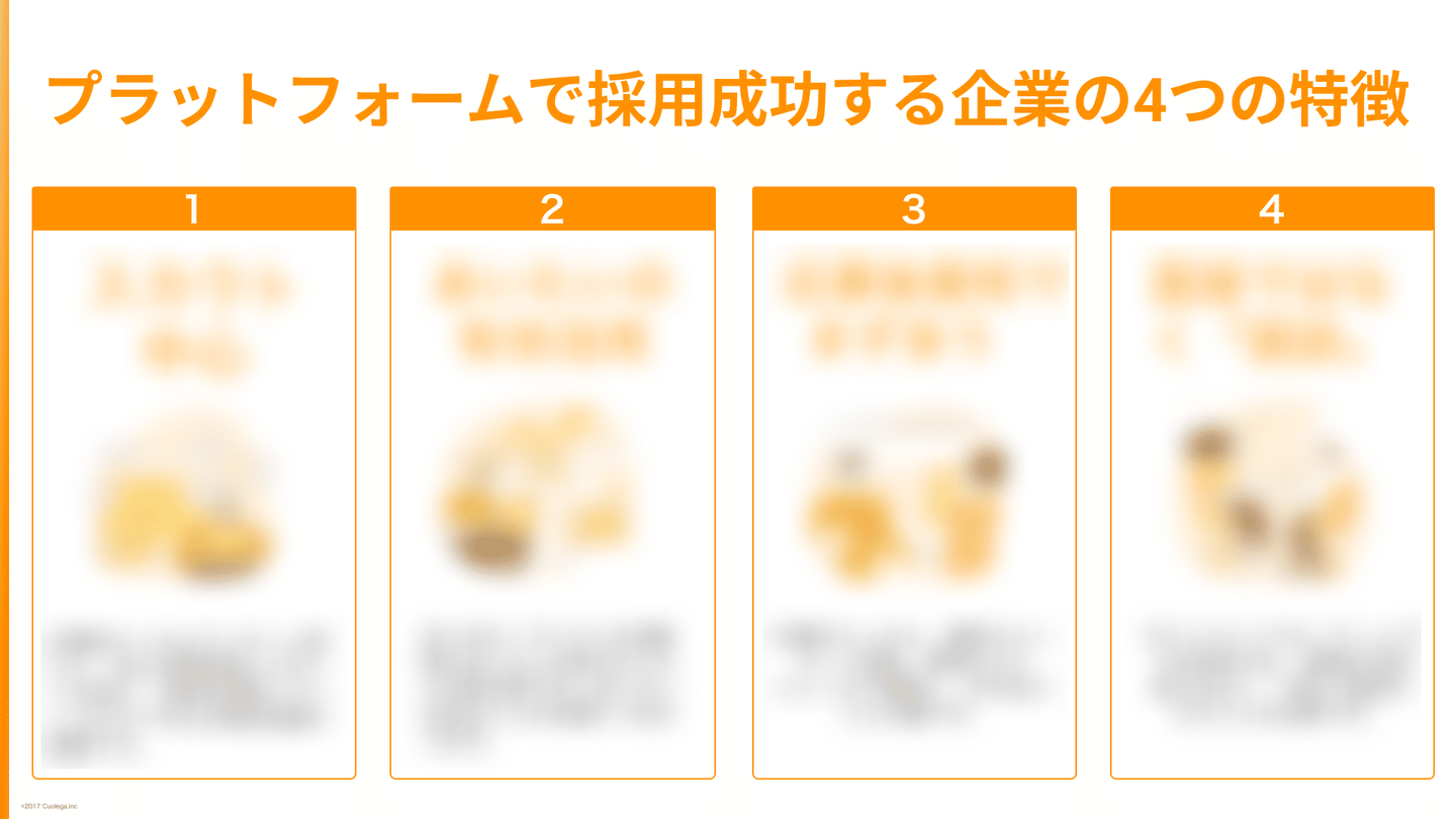 プラットフォーム上でダイレクトリクルーティングに成功する企業には、大きく4つの特徴があり、企業様にそのアクションをやっていただかないと、正直望む成果を得ることができません。