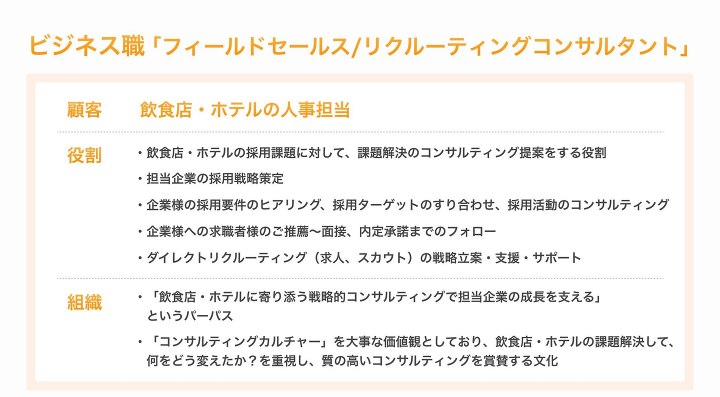 自分のコンサルティング営業で採用という切り口から飲食・ホテル企業の成長に貢献できますし、コンサルティング力・提案営業力を磨きたいという方は非常に合っていると思います。