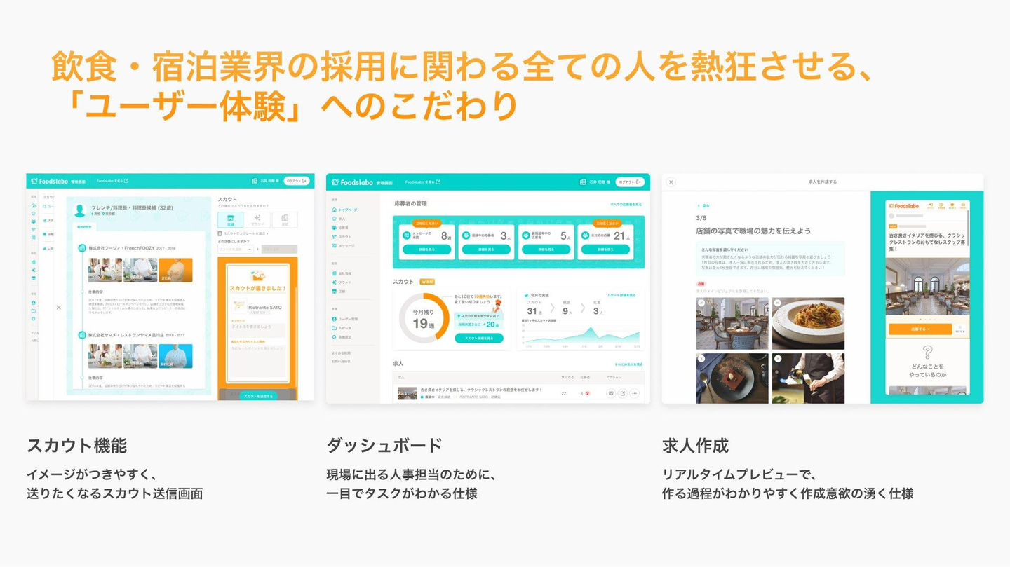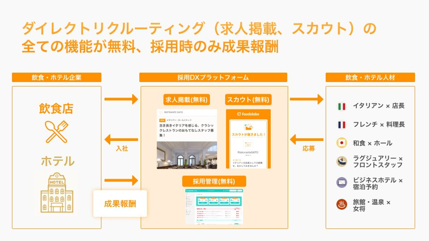 プロダクト視点でもFoodsLabo、HotelsLaboは求人掲載、スカウト、全て無料で求職者様が入社して初めて費用をいただくので、まず求人を掲載してもらって、スカウトを送っていただかないとまったく価値提供できない。