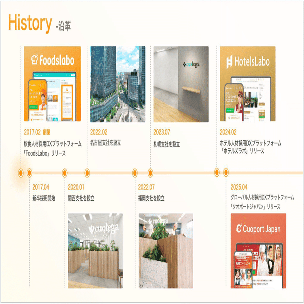 現在は9期目を迎え、社員数は150名を超え、2024年にホテル人材採用プラットフォーム「HotelsLabo」、2025年には外国人採用プラットフォーム「Cuoport Japan」を新規事業として開始しました。