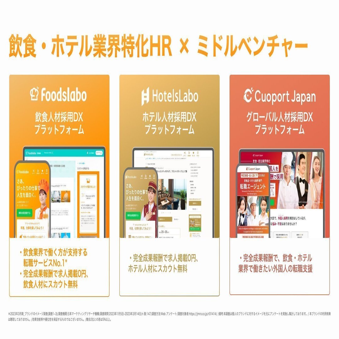 売上規模は数十億円、次は売上100億円を目指しています。飲食人材採用プラットフォーム「FoodsLabo」はわずか数年で数十億規模まで成長し、2024年にはホテル人材採用プラットフォーム「HotelsLabo」、2025年には外国人採用プラットフォーム「Cuoport Japan」も本格展開を開始しました。