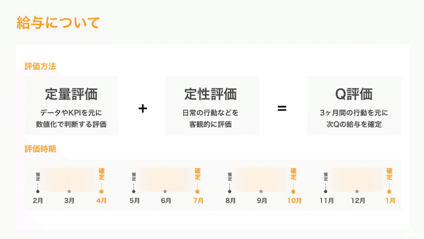 新卒の成長スピードを最大化するために、年4回、つまり四半期ごとの評価制度を導入しています。これは、ベンチャー企業の成長スピードと、新卒の成長サイクルを完璧に同期させるための戦略的な制度設計なんです。