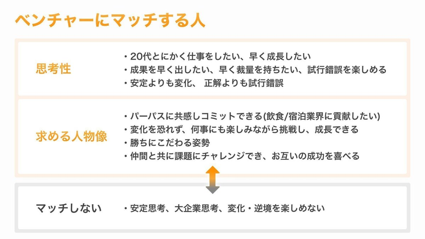 ですので、目的思考が強くて、課題解決ファースト、意思決定や変化を受け入れられる(もちろん背景説明は行いますが)、なんでもかんでもポジティブに変換できて、自分からあらゆることをを面白くできる人を採用したいなと思っています。