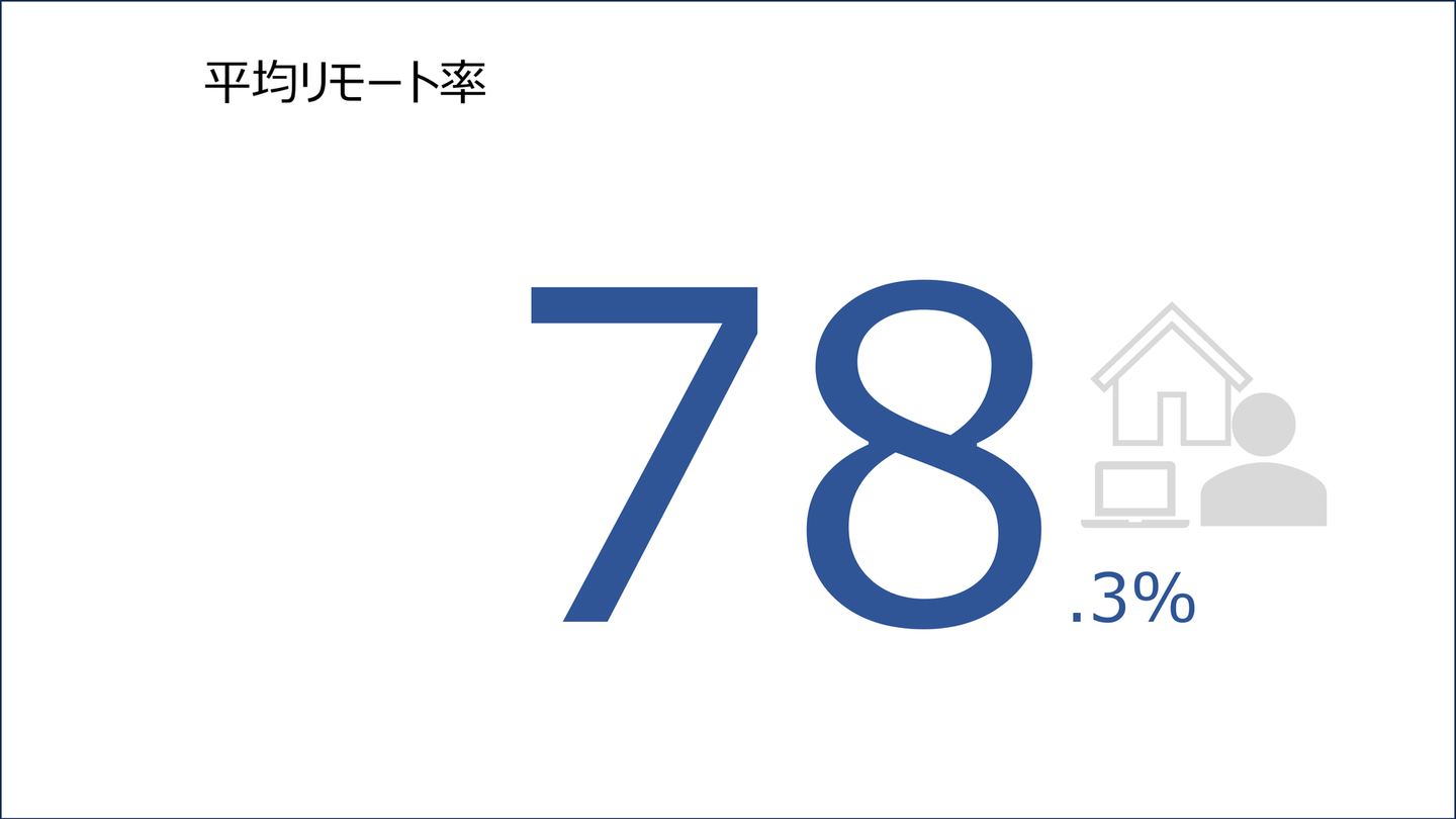 現在はハイブリット出社となっております。事業によって変わってくるのですが、SES事業も含め、平均は78.3%と比較的高いリモート率となっています。リモート慣れしていても、出社することでよい刺激があることは私も身をもって感じているため、出社もよい影響があります。