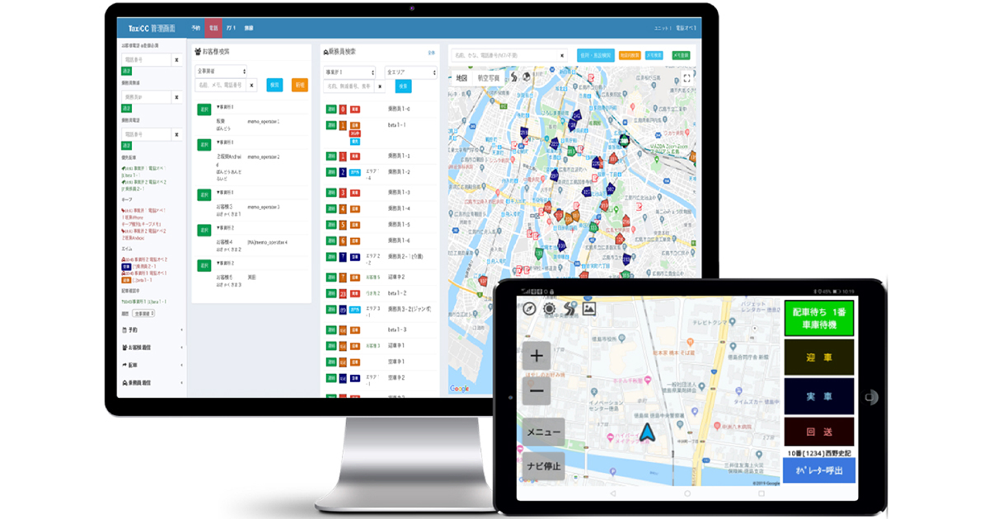クラウド型タクシー配車システム「DS」は、配車オペレーター用画面とドライバー用車載タブレットをセットにした配車システムで、タクシー事業者の業務効率化を実現します。現在、全国47都道府県で約600社・約2万台のタクシー車両に導入されています。