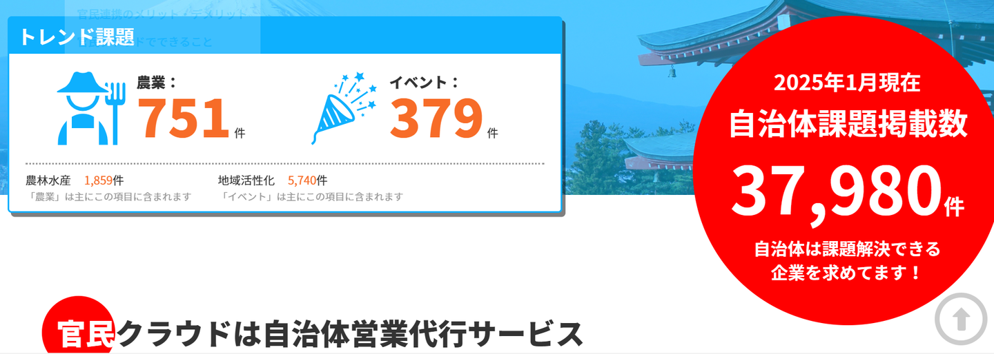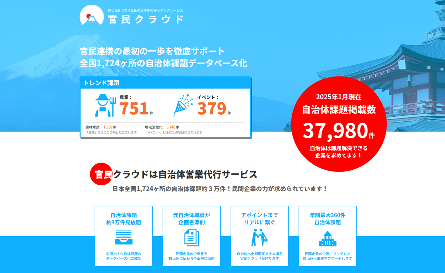 自治体の課題をデータベース化し、その課題を解決できる民間企業が手をあげてマッチングするサービス。企業の企画書を自治体に伝わるよう添削し、自治体へ提案するためのアポイントまで官民クラウドがおこなう。