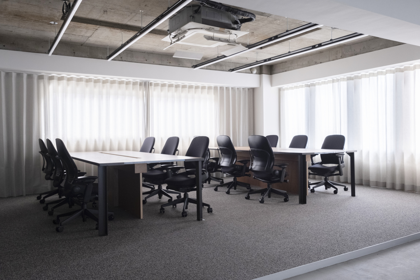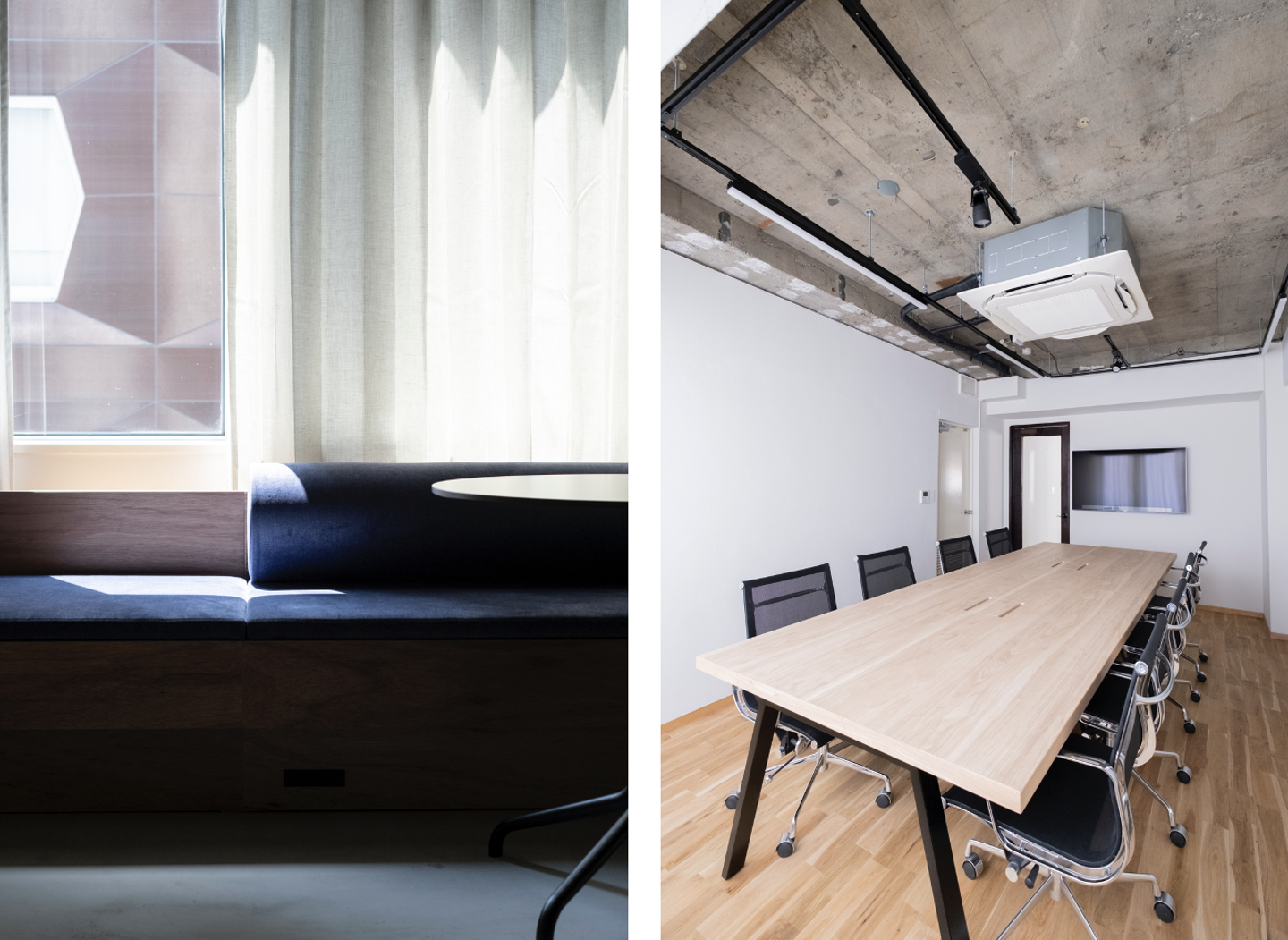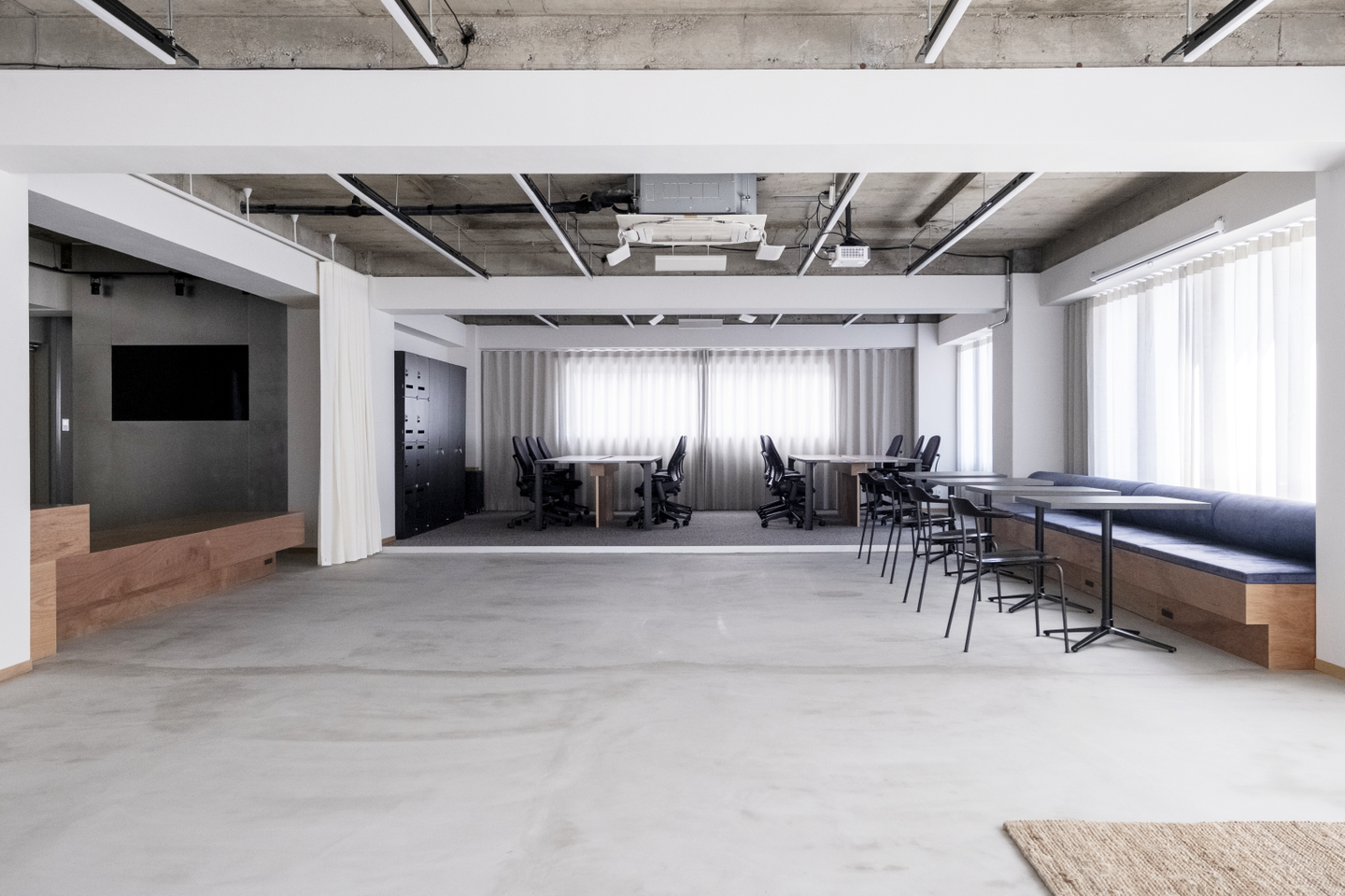 日当たりのよい執務空間をカーテンで仕切ることで、温度調整をしやすくし環境に配慮したほか、オンライン/オフラインイベントの開催時にはカーテンを開くことで、広い空間全体を有効活用できます。さらに、執務スペースには、過去に入居していたスタートアップ企業に代々受け継がれてきたデスクを当社オフィスのデザインに合わせ、アップサイクルして活用しました。