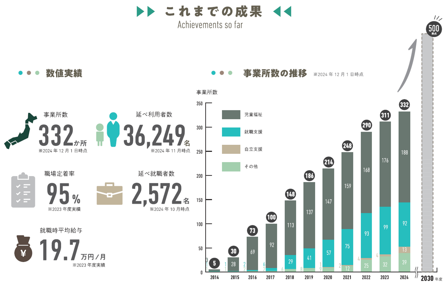 そして、私たちはそれらを、「ビジネス」として、持続可能かつスケーラブルな形で実現させてきました。特に、想いを共有する全国のパートナー企業と共に事業を拡大する「ソーシャルフランチャイズ」という仕組みは、私たちのソーシャルインパクトを加速させる大きな力となっています。