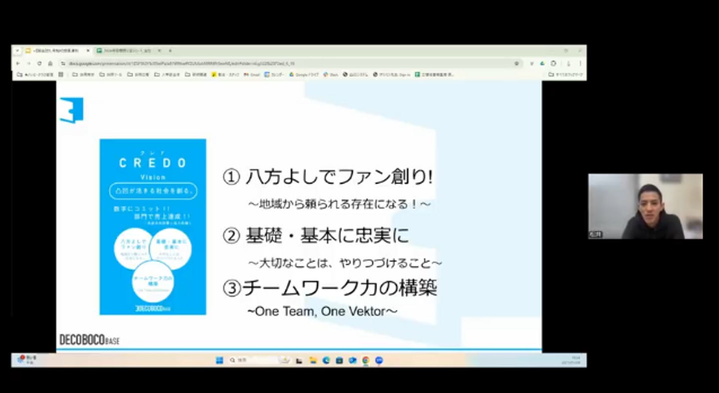 代表・松井より、昨年のCREDO(企業活動が拠り所とする価値観・行動規範を簡潔に表した言葉)を意識できていたかの問いかけからスタート。
