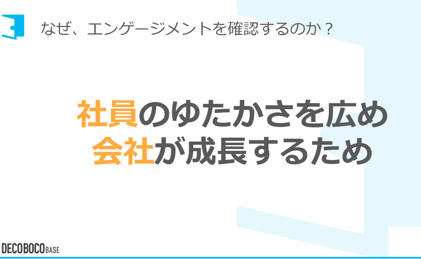 代表の松井より、「そもそもエンゲージメントとは?従業員満足度と何が違うの?」という説明から、「では、なぜデコボコベースはエンゲージメントを向上を目指しているのか?」の共有をしました。