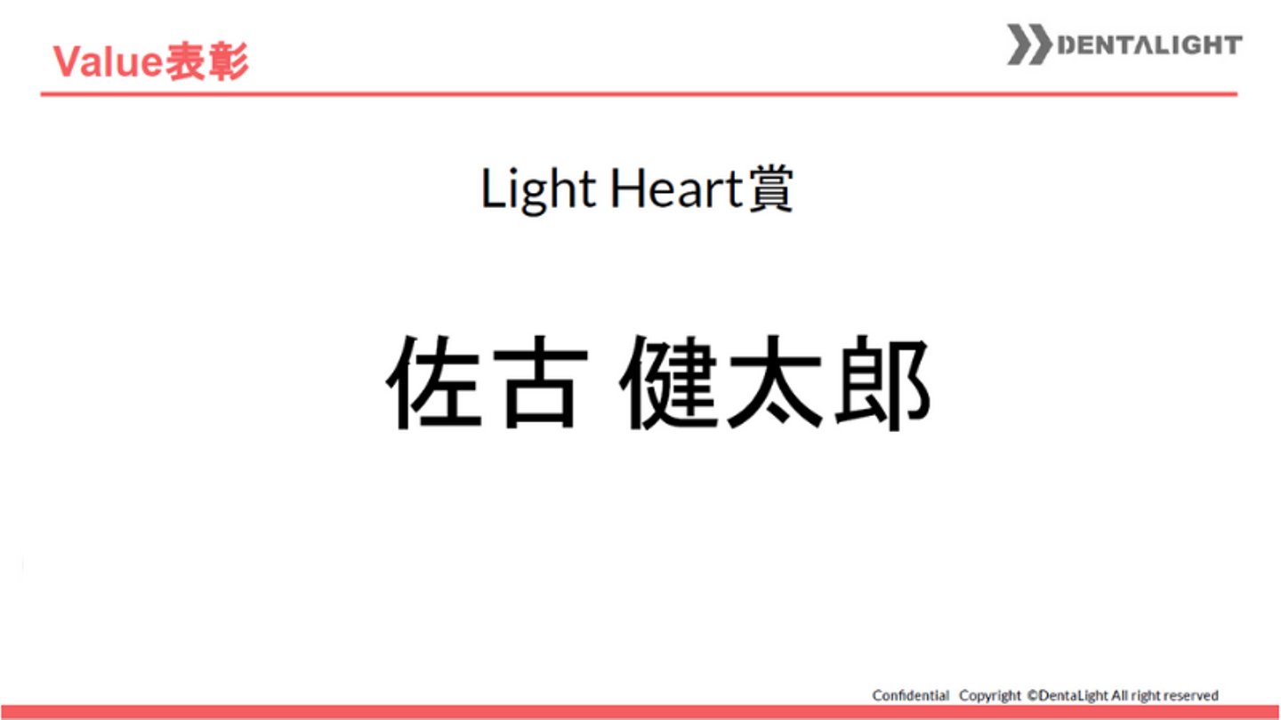DentaLightには7つのバリューがあり、そのバリューを体現したメンバーの表彰式が四半期ごとに行われています。