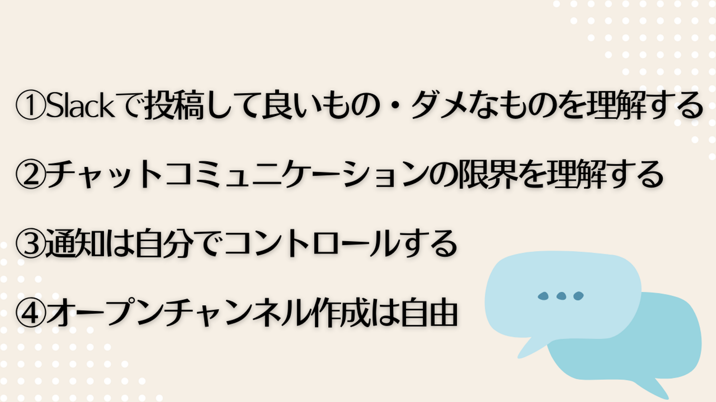 - ただし、チャットが非同期コミュニケーションであることを十分に留意し、すぐに返信が来ることを期待しない。