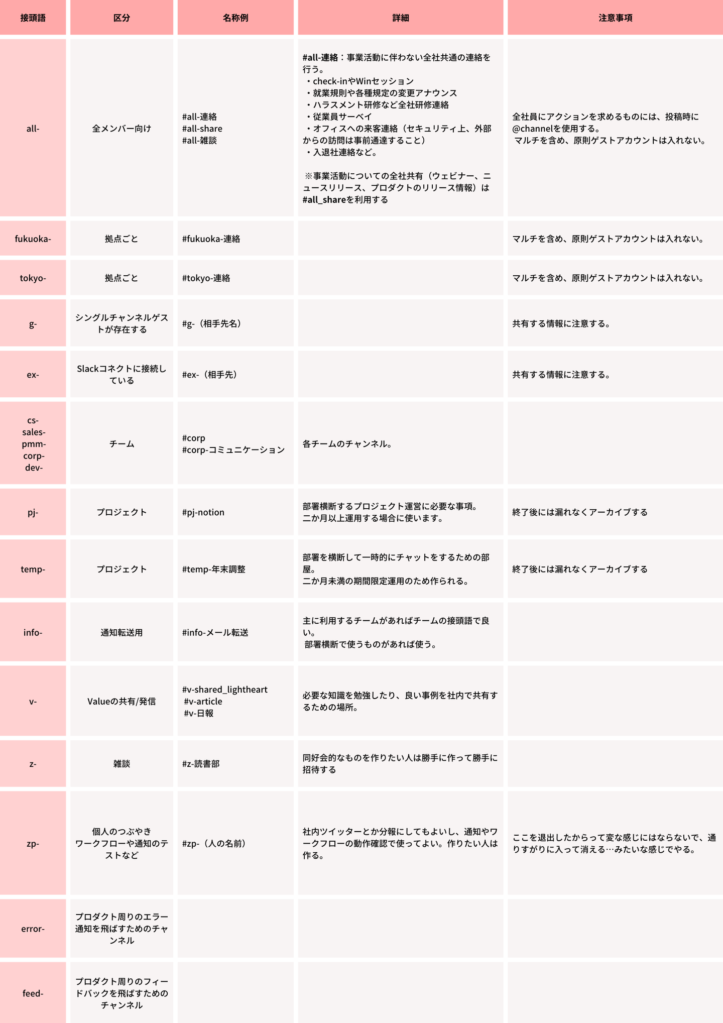 - 接頭語が重複する場合は、下記の表で上にあるものほど優先度が高いので、先頭に書く。例えば、ゲストがいるプロジェクトチャンネルの場合、「#g-pj-〇〇」と記載する。
