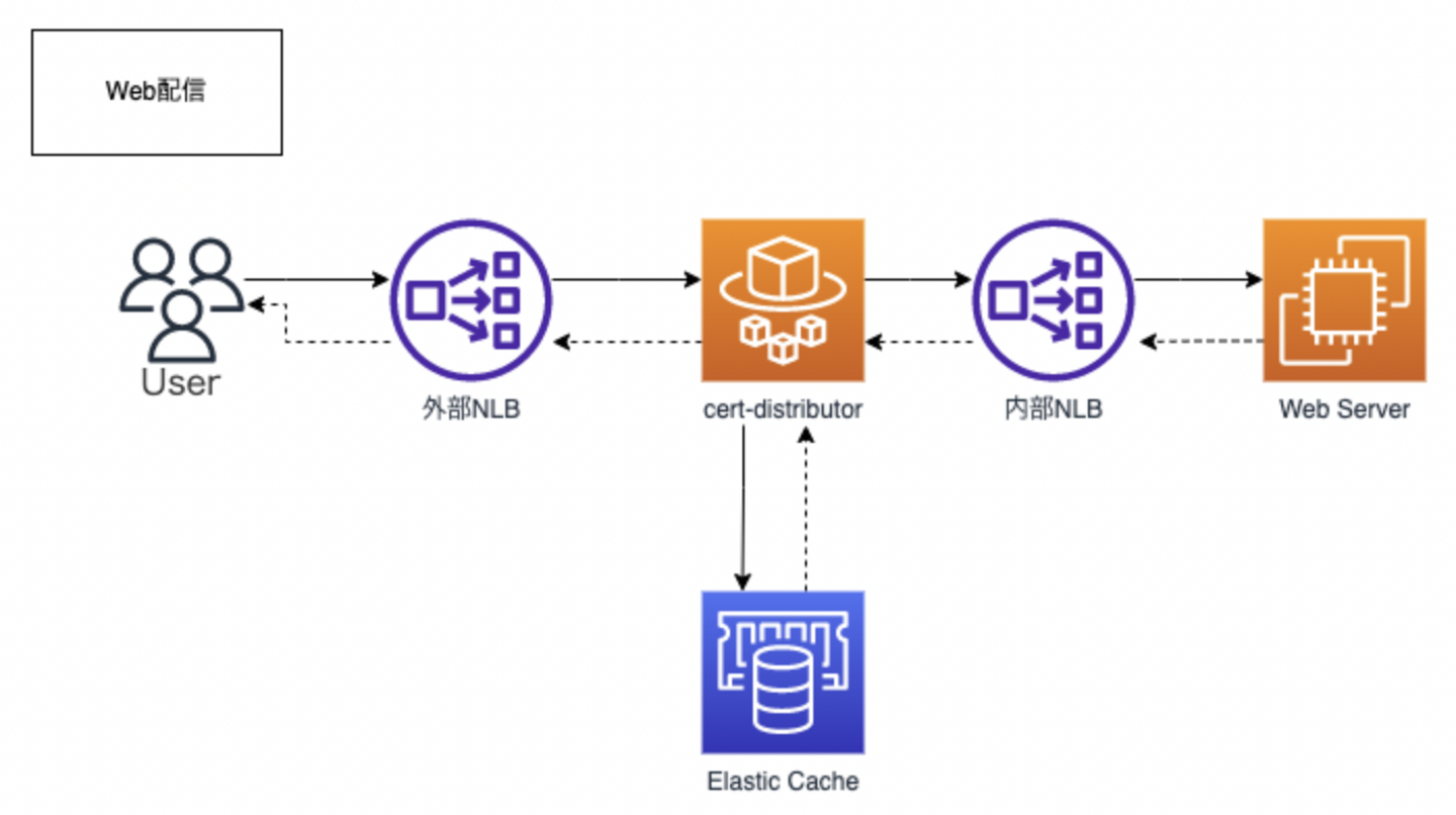- エンドユーザーがSlideflowで公開されたコンテンツにアクセスすると、外部NLB経由で、Fargate cert-distributorにリクエストが投げられる。