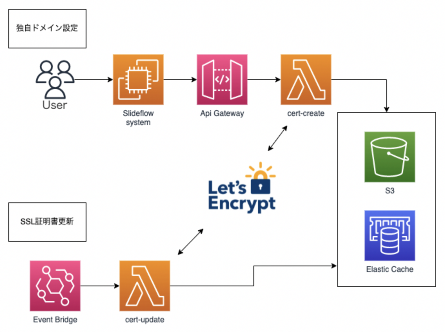 - Lambda cert-updateでは、SSL証明書の有効期限が30日以下の証明書のドメインリストを取得し、 Let's Encrypt で証明書を更新し、SSL 証明書 (crt) と 秘密鍵 (key) を ElastiCache Redis とS3 に保存する。