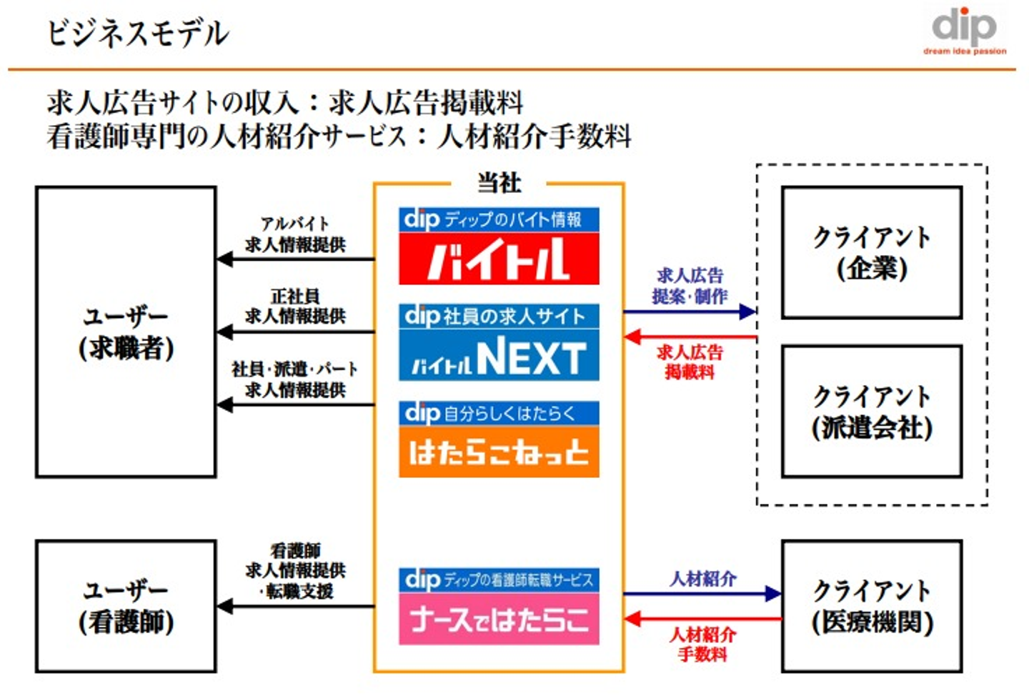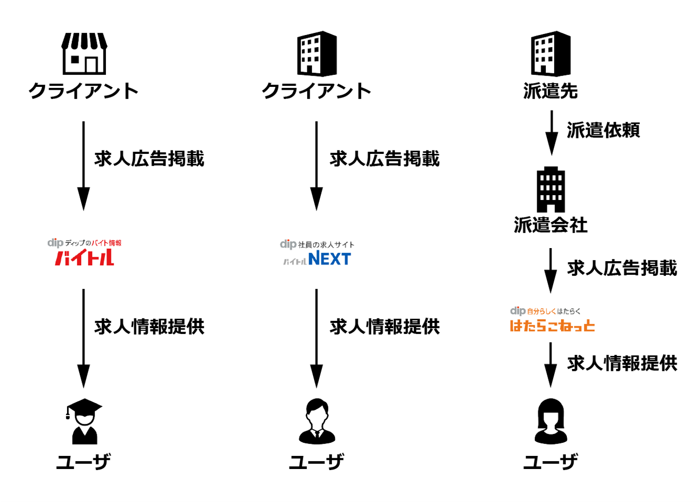 はたらこねっとの構造を見てみると、ディップが派遣会社から求人広告の掲載案件を獲得していることがわかります。