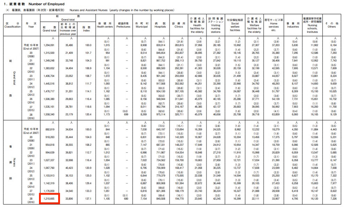 ※見にくい資料ですいませんが、2018年で看護師さんは約120万人ぐらい日本にいます。