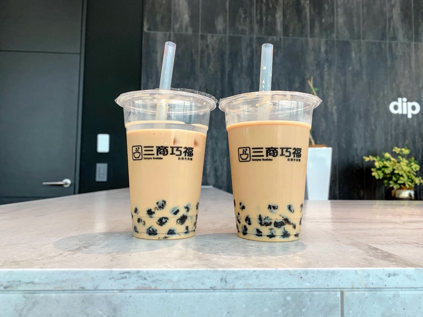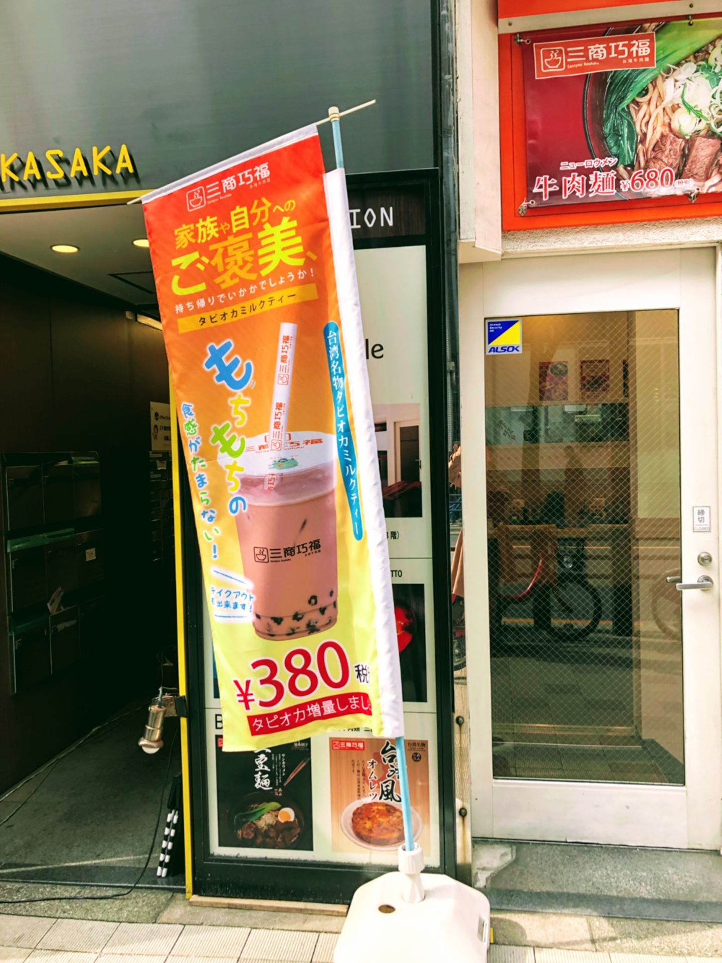 目的地である「台湾牛肉麺店 三商巧福」に到着しました。タピオカミルクティーの旗も立っています。旗にも書いてあるとおり、自分たちへのご褒美としてタピオカミルクティーを購入します。