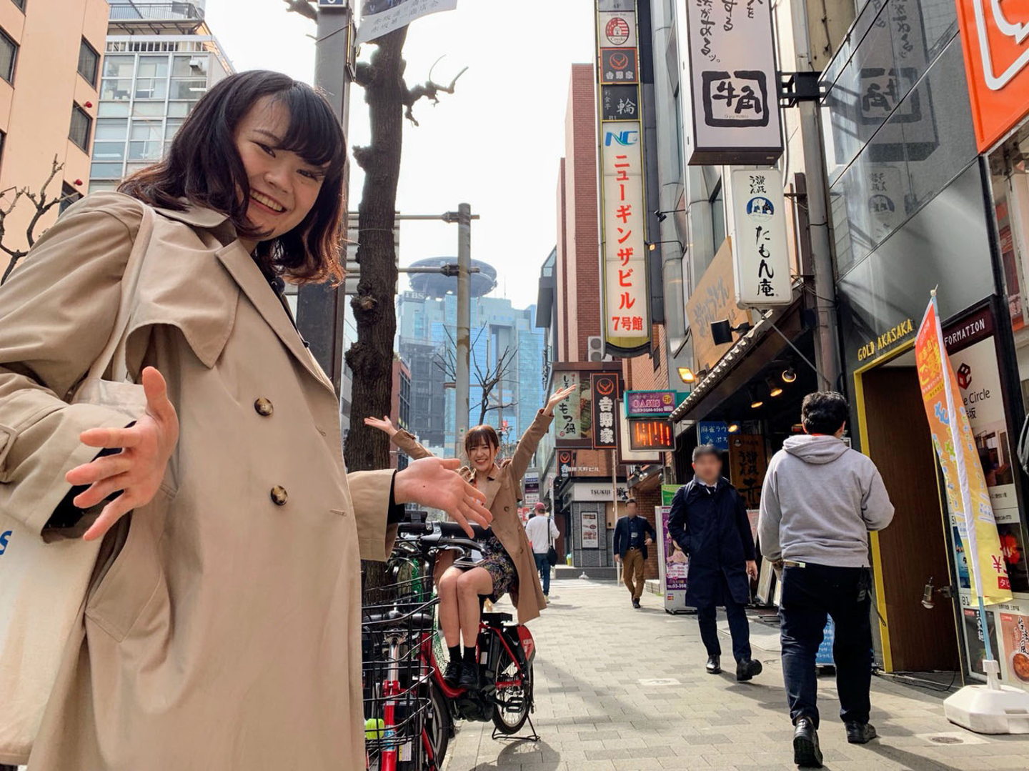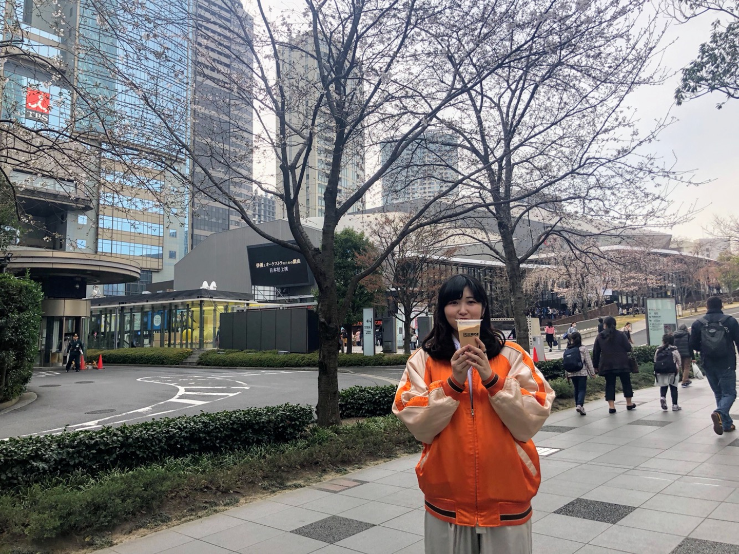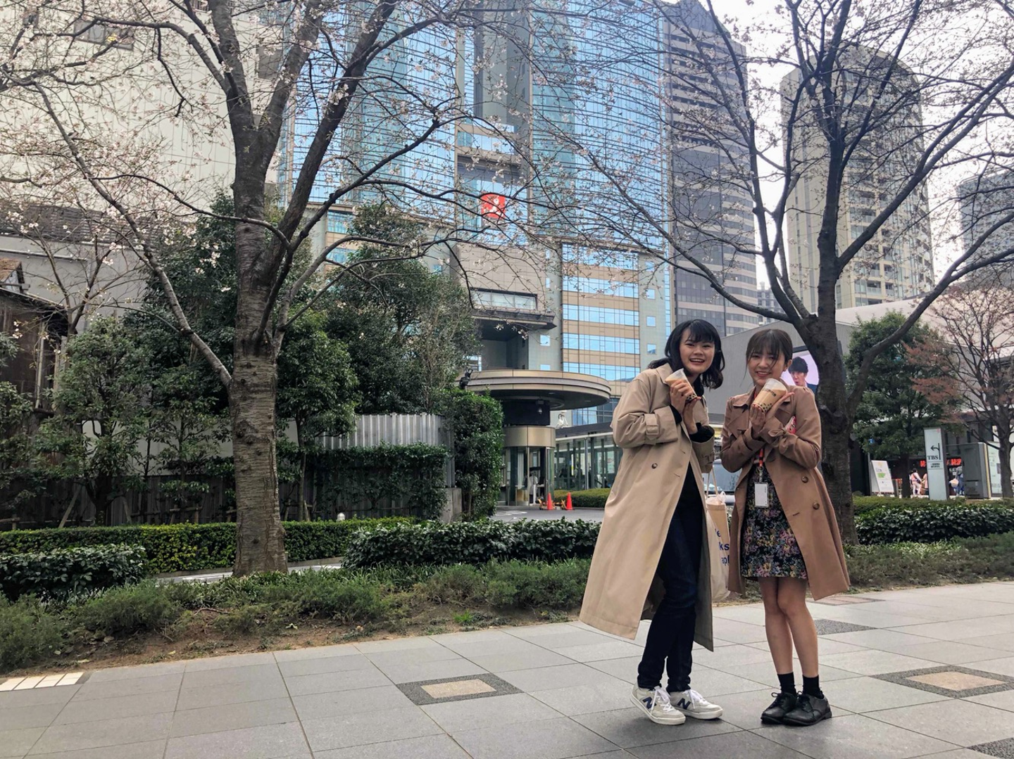 赤坂サカスで、念願のタピオカミルクティーと記念撮影です。赤坂の桜も咲き始めていました。