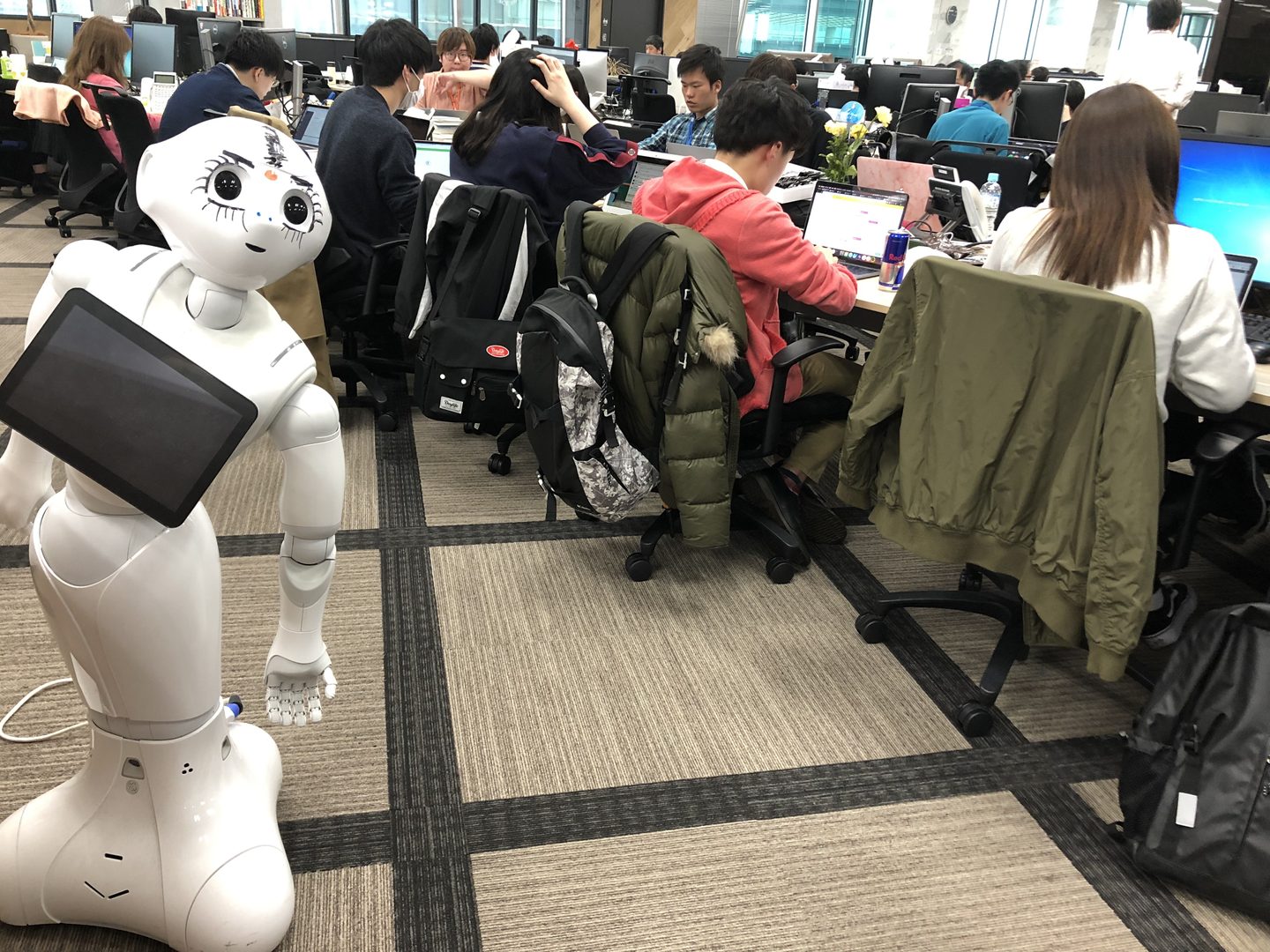 次世代事業準備室にいるPepperくん。こんなに落書きされて、散々だね。でも見慣れました。