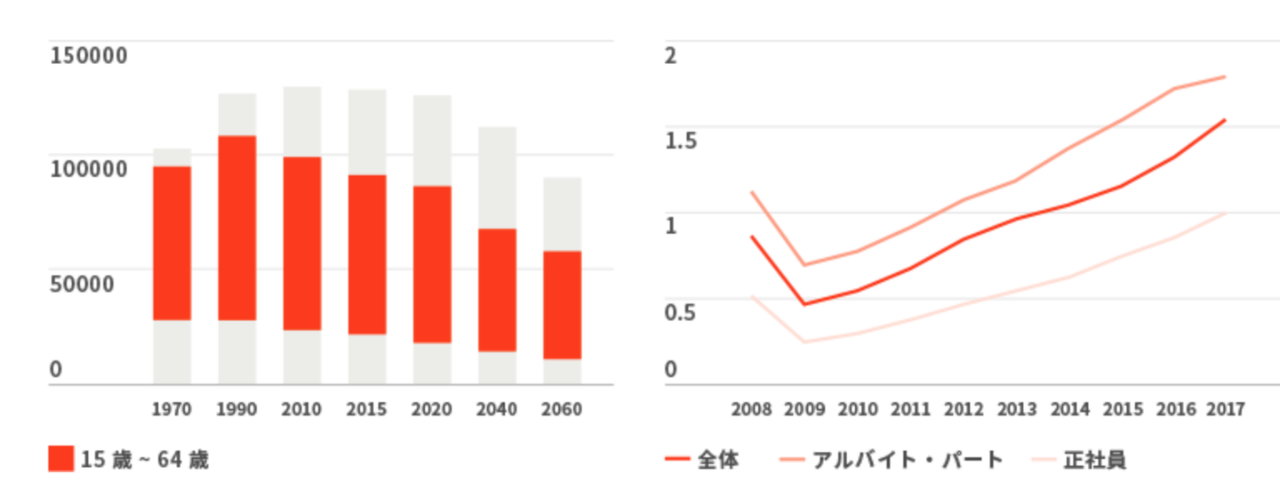 人口は2015年をピークに下降。少子高齢化により、生産年齢人口が大きく減少しています。平成31年2月の有効求人倍率(※1)はリーマンショック前の水準を超え1.63倍(※2)となり、45年ぶりの高水準に達しました。それに伴い、労働力不足は深刻化し、人材採用や活用(定着・育成)に悩む企業は増加の一途に。人材ビジネスの需要は今後も益々高まっていくことが予想されます。