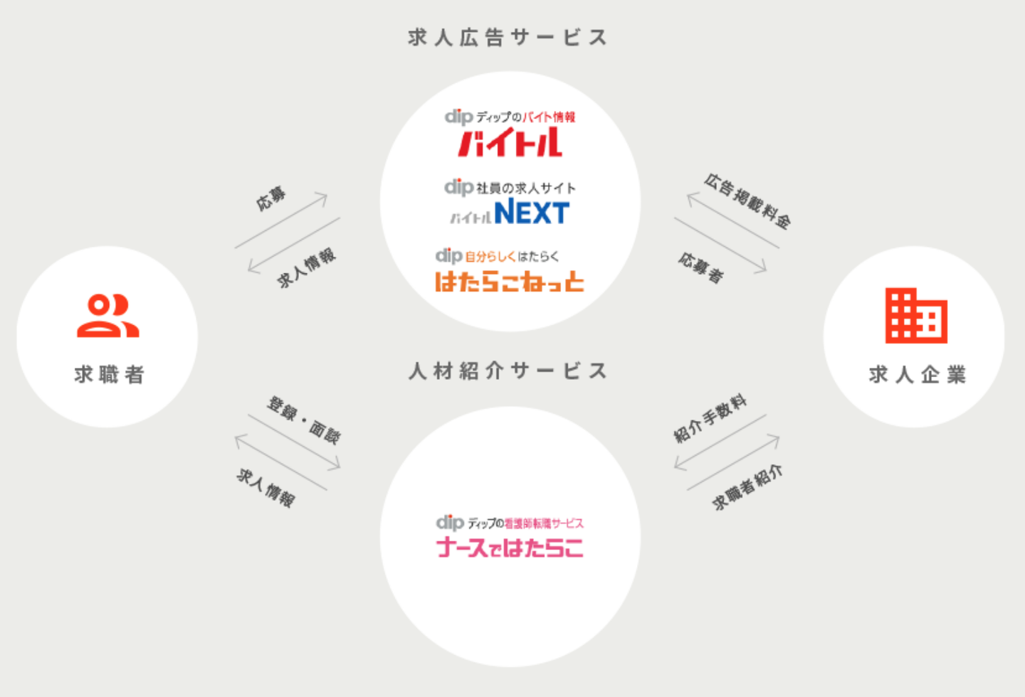 人と企業を結ぶ日本最大級の求人情報サービスと、看護師転職支援サービスを展開しています。