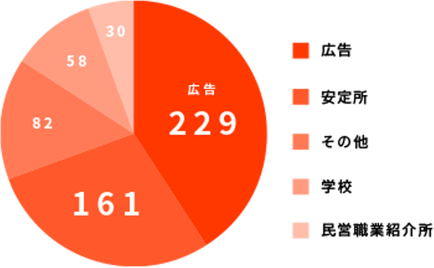 入職経路別の入職者数を見ると、求人広告を通じて就職する人数は年間で229万人と最も多いことが分かります。(※厚生労働省「入職経路別入職者数」)