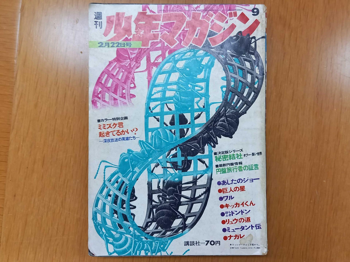 本当に今の少年雑誌とは様子が違っていて、まず表紙がエッシャーです。「巨人の星」、「あしたのジョー」、石森章太郎、永井豪、ジョージ秋山、さいとう・たかをが載っています。「星一徹のモーレツ人生相談」というコーナーがあったり、秘密結社の特集で血を流した人の画像が載っていたり、漫画の隅に作者の住所が載っていたりと、とにかく色々と時代の違いを感じます。情報量が多すぎてまだ読みきれていません。これが週間だったというのですから恐ろしいものです。
