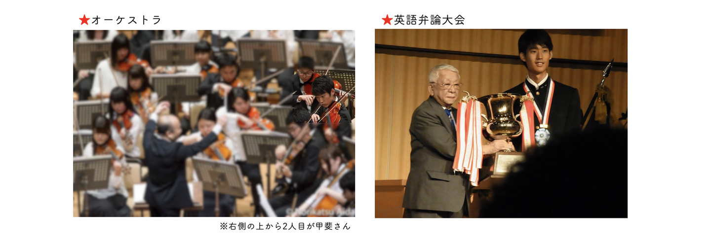甲斐:中高で硬式テニスをしていたんですが、中学校には硬式テニス部がなくて。バドミントンをしている人たちが楽しそうだなと思って、そんなノリでバトミントン部に入りました!あとは、オーケストラもやってました。小さい頃からバイオリンを習っていたので、中高ずっとオーケストラに所属していて最終的にはジュニアオーケストラの副団長も経験しました。あとは、英語弁論とかもやってましたね!アメリカに住んでた経験があるのでズルいかな?とも思ったんですけど(笑)それも中高でやっていて、高校3年生の9月くらいまで部活、オーケストラ、英語弁論の全部をやっていましたね!