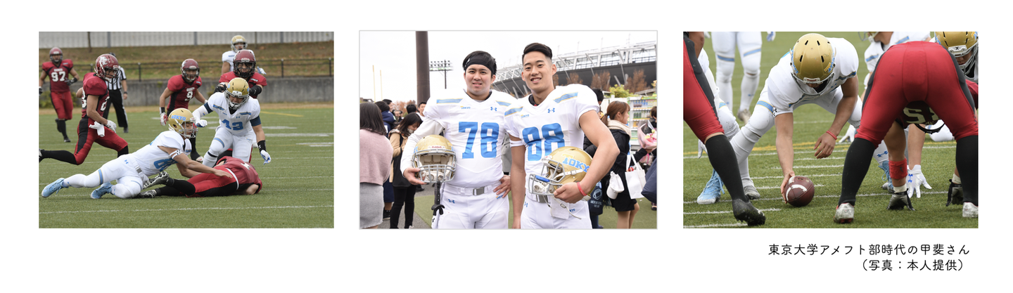 甲斐:そうですね!先程もお話しした通り、高3の9月10月まで受験勉強をしていなかったので、全然間に合わず(笑)1年の浪人を経て、東京大学に入学しました。元々理系だったので、リーチから工学部に行ったですけど、「アメフト部」に出会ってしまって!!!大学時代は、工学部というよりも、ほぼアメフトが中心の生活だったかなと思いますね!かなり本気でやっていて、週6・7?ずっとアメフトをしているような生活でした。