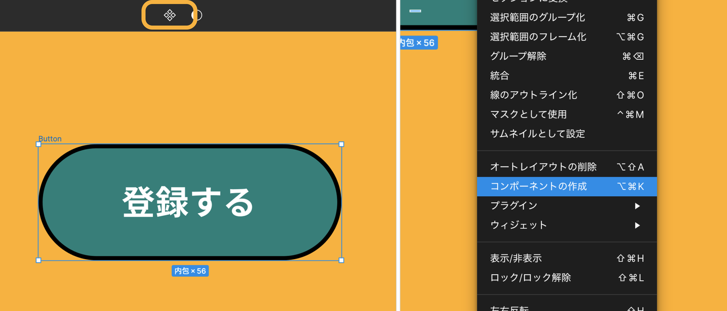 選択しているオブジェクトから、メニューバー中央に位置するひし形のアイコンをクリックする、もしくは、右クリックし、メニューの中から「コンポーネントの作成」をクリックするとコンポーネントを作ることができます。